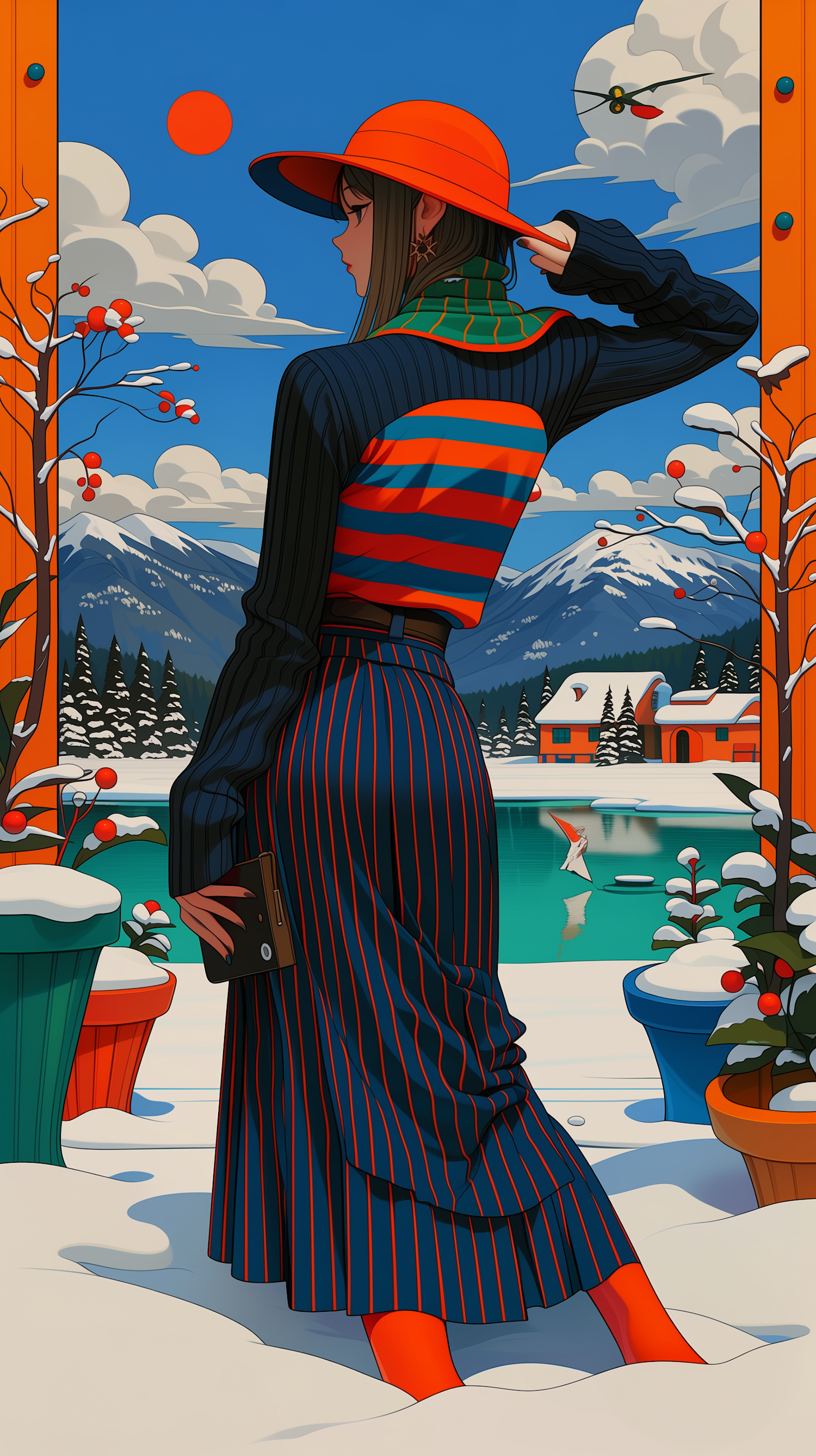 A fashionable figure in a vibrant outfit stands in a snowy landscape with a lake, mountains, and colorful details, creating a striking scene.