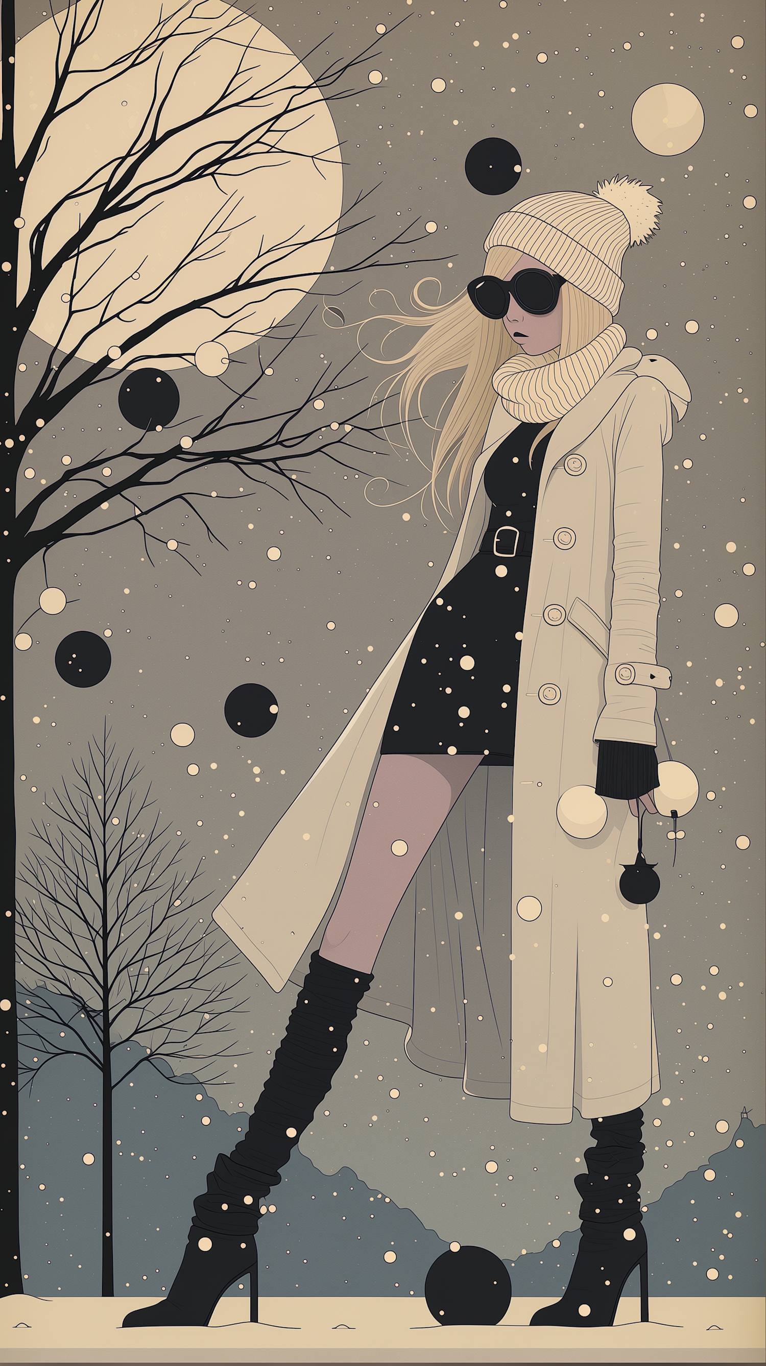 Stylized winter scene of a fashionable woman in a beige coat and black dress, standing under a full moon in a snowy landscape.