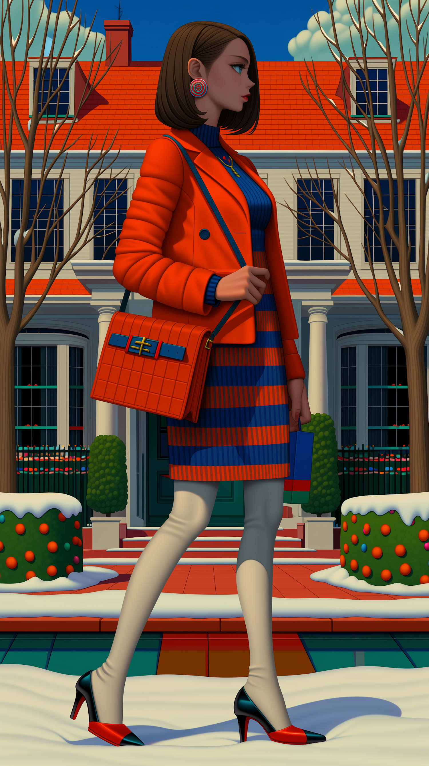 A fashionable woman in an orange coat and striped dress walks in a snowy setting, with a vibrant house and winter scenery in the background.