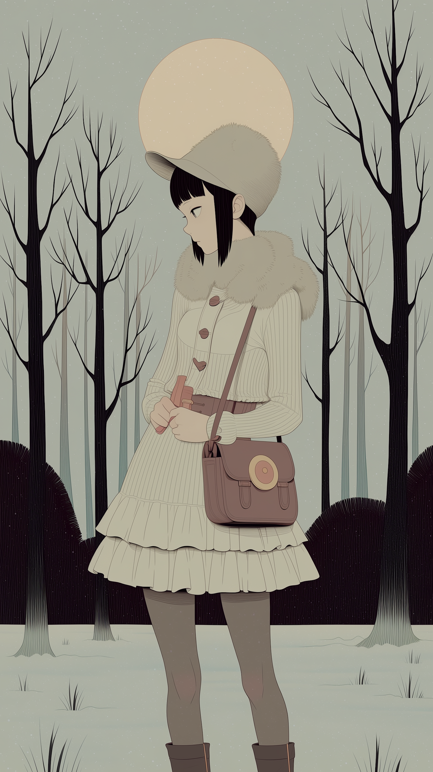 Stylized illustration of a woman in a winter forest, wearing a white dress and fur-trimmed coat, with a glowing moon in the background.