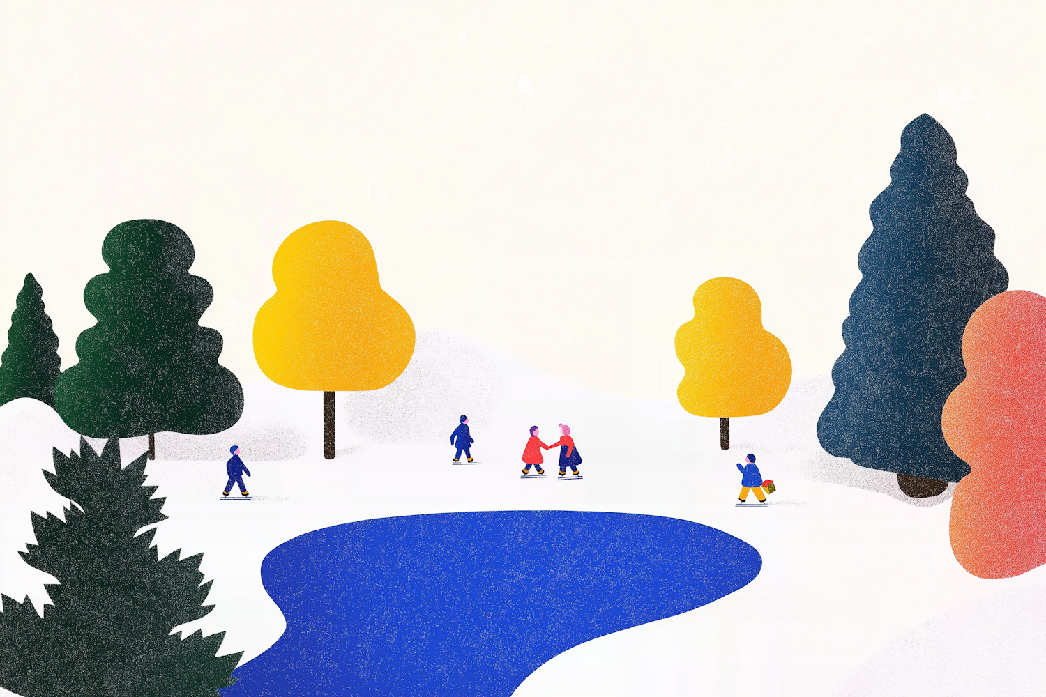 Whimsical winter scene with colorful trees and people ice skating on a vibrant blue pond, creating a playful and serene atmosphere.