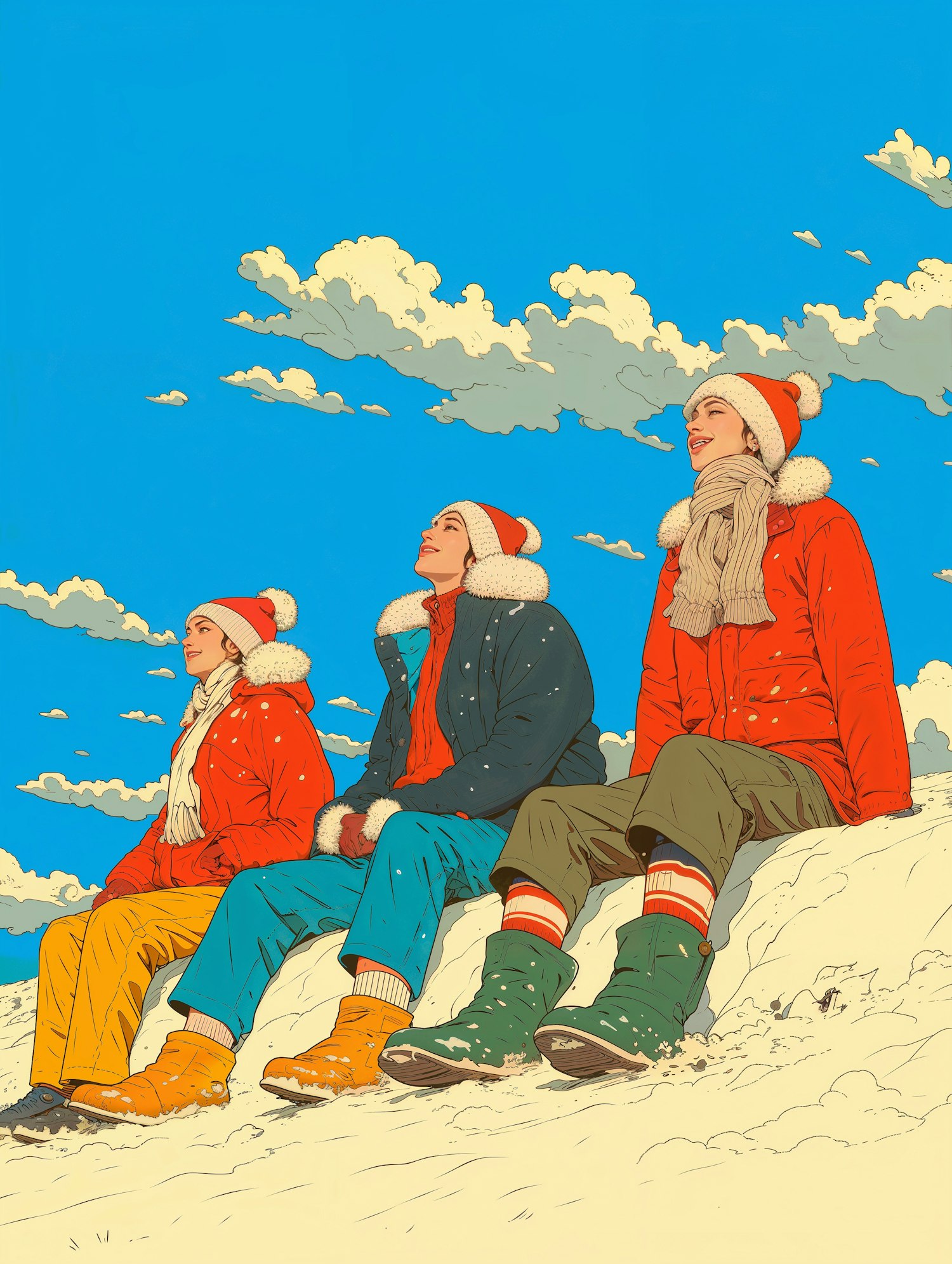 Three people in colorful winter clothes sit on a snowy hill under a bright blue sky with fluffy clouds.