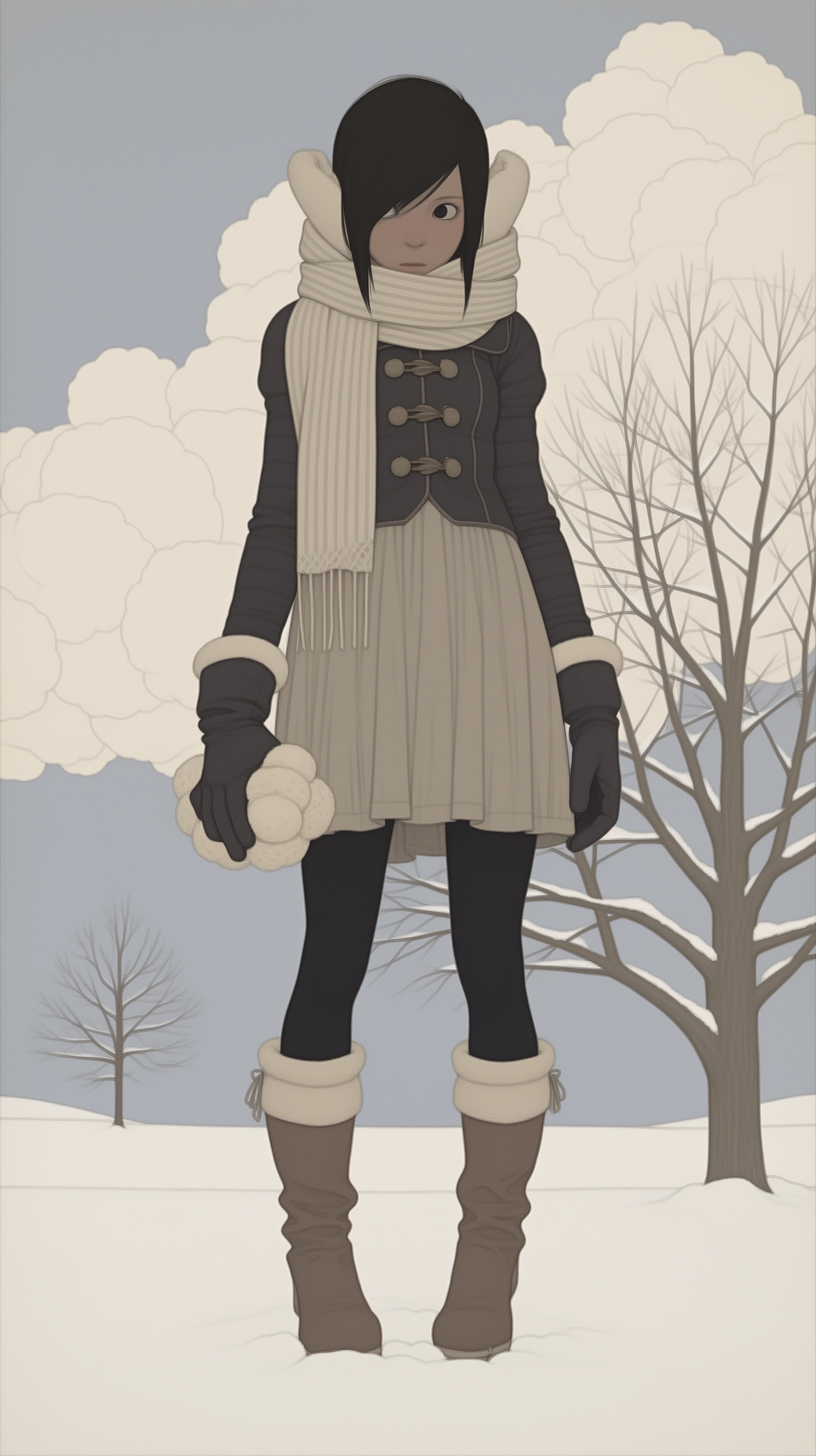Stylized illustration of a person in winter attire standing in a snowy landscape with bare trees and a cloudy sky.