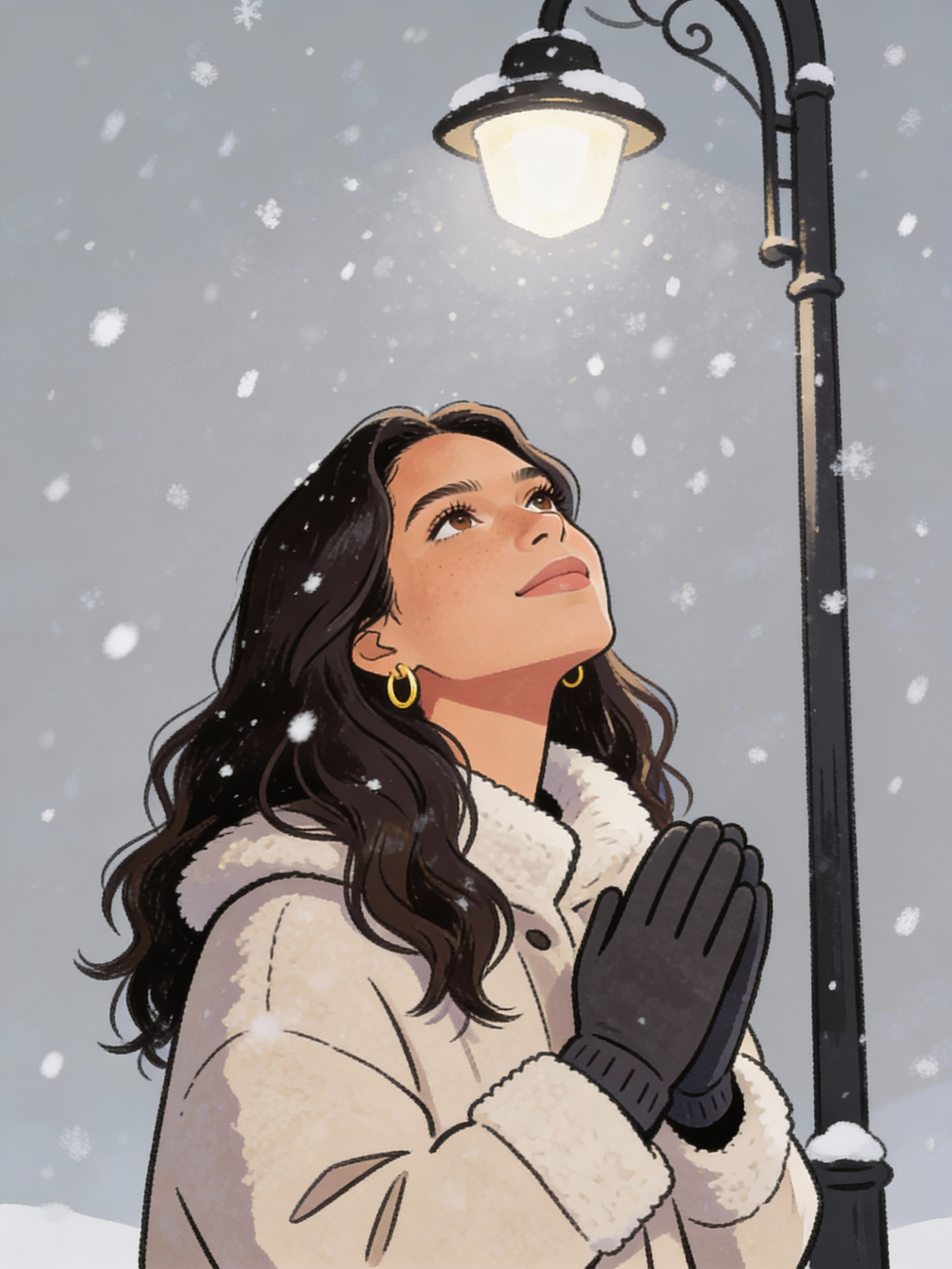 A serene winter scene of a woman in a cozy coat under a glowing streetlamp, gazing at falling snowflakes with a peaceful expression.
