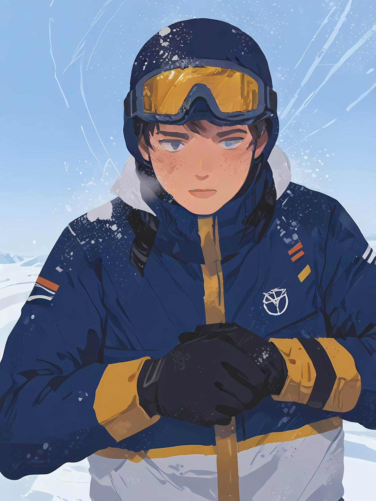 Stylized illustration of a freckled skier in navy and yellow gear, holding a ski pole against a snowy backdrop with a clear blue sky.