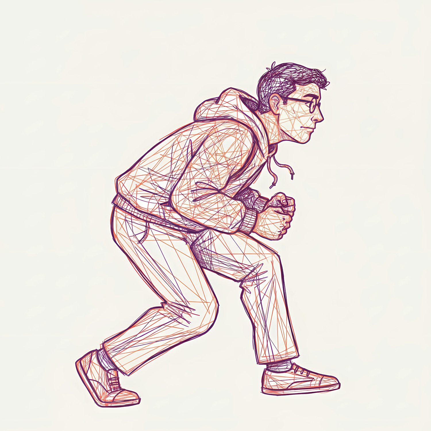 Stylized line art of a crouching figure in a hoodie and glasses, drawn with intersecting lines for a unique wireframe effect.
