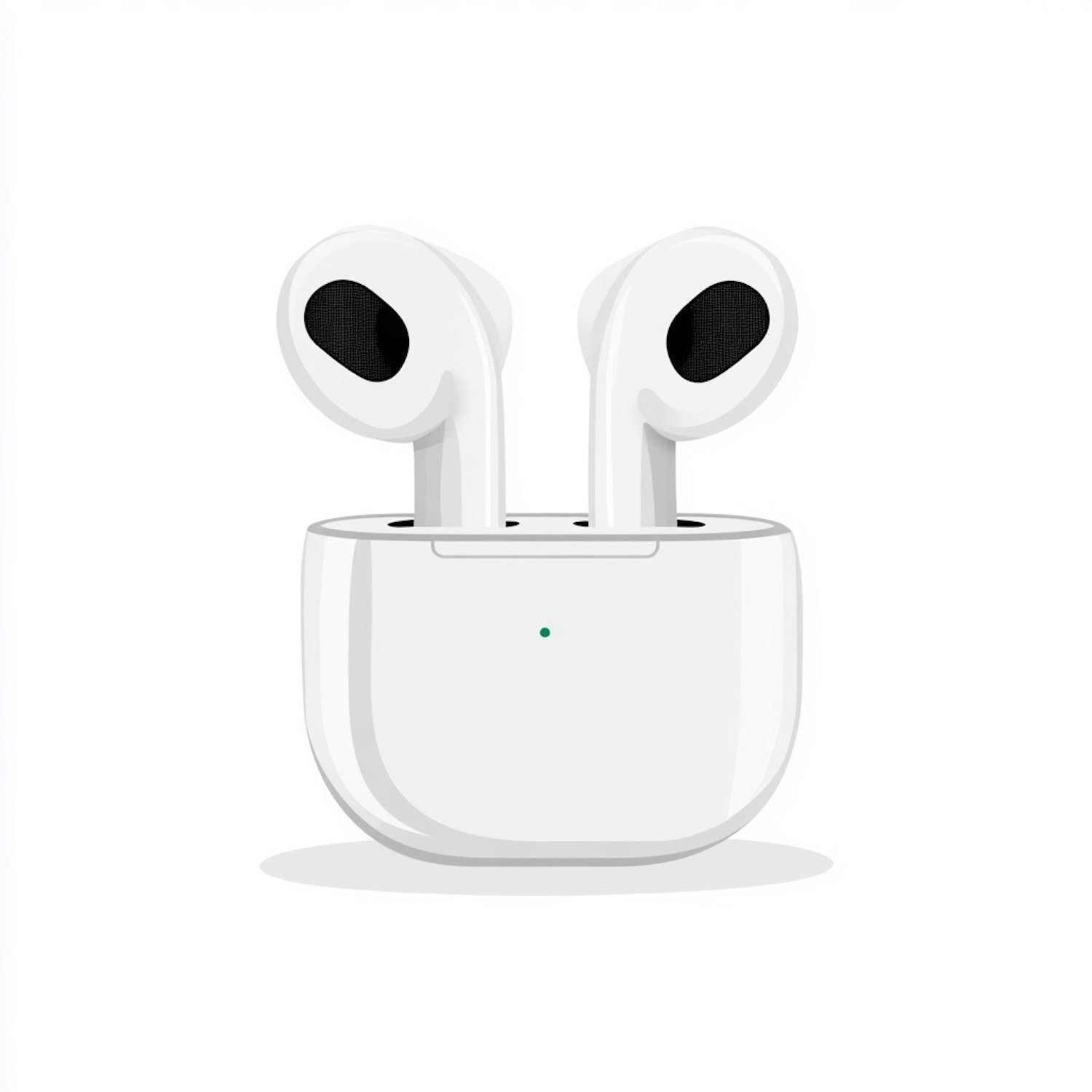 Minimalist illustration of white wireless earbuds in a charging case with a green LED indicator, set against a clean white background.