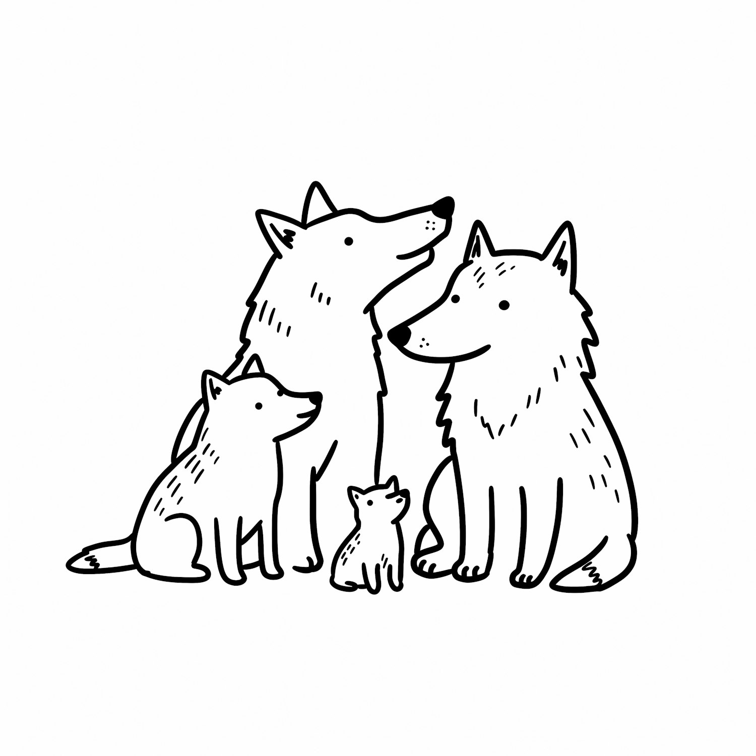 A delightful black-and-white illustration of a wolf family, showcasing two adults and two pups in a close and loving arrangement.
