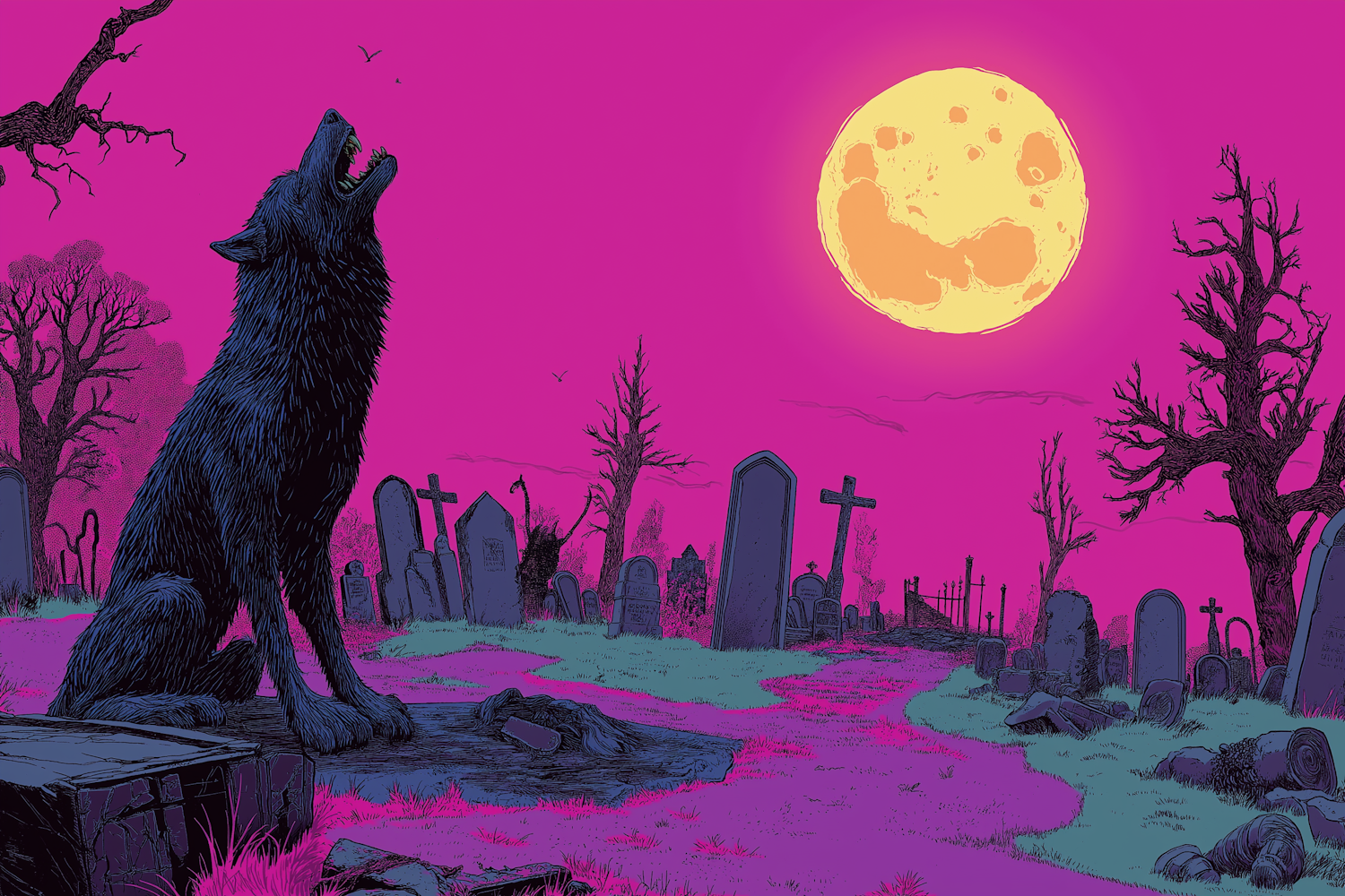 A black wolf howls at the full moon in a graveyard under a magenta sky, surrounded by tombstones and bare trees.