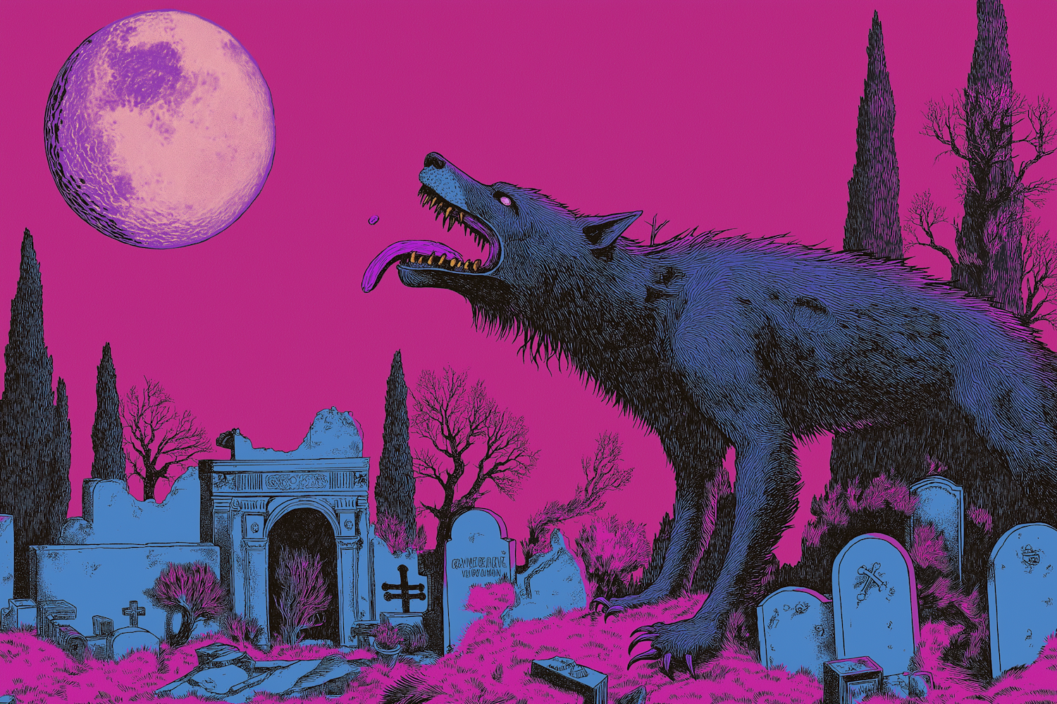 A dark wolf in a graveyard under a pink sky with a full moon, surrounded by tombstones and leafless trees. Eerie and atmospheric illustration.