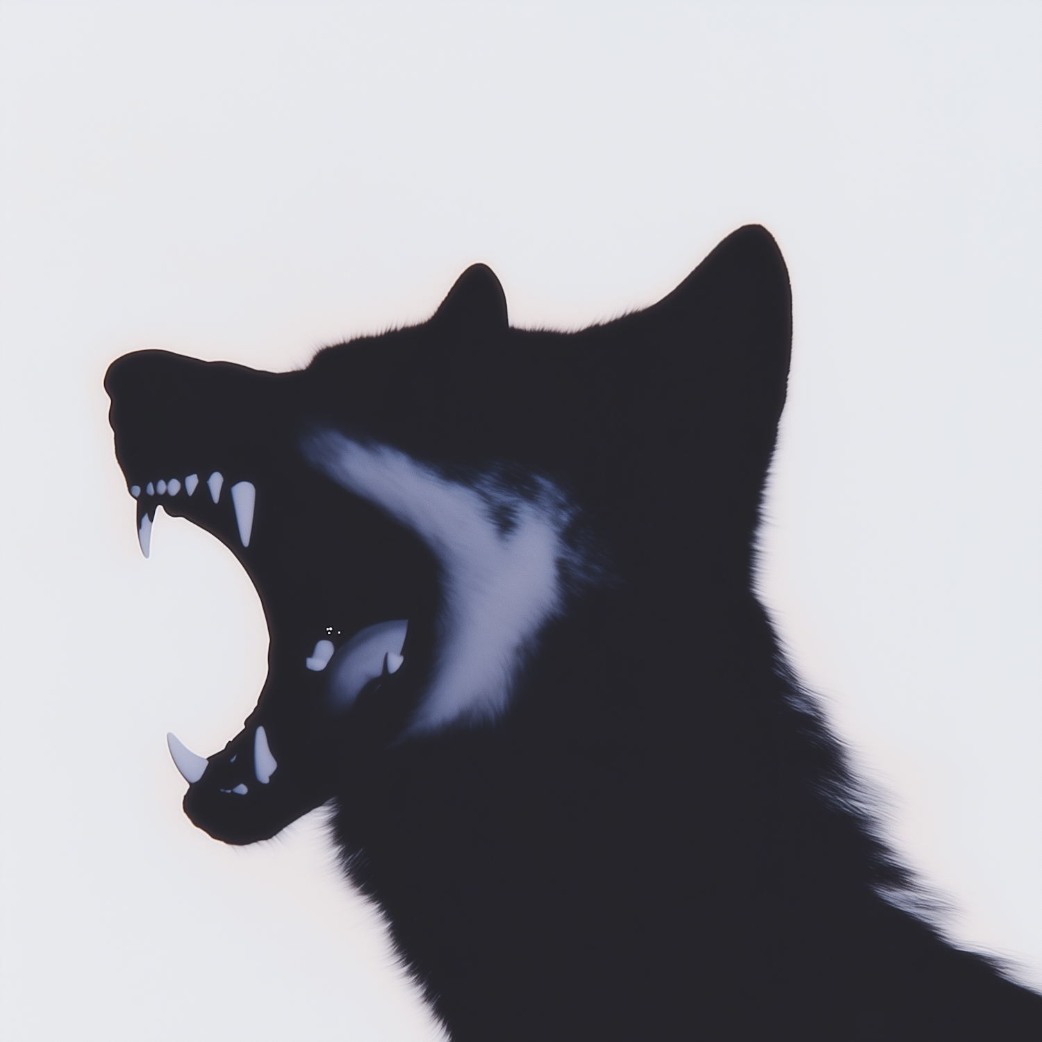 Silhouette of a wolf with its mouth open, showcasing sharp teeth against a light background. Minimalist and striking design.
