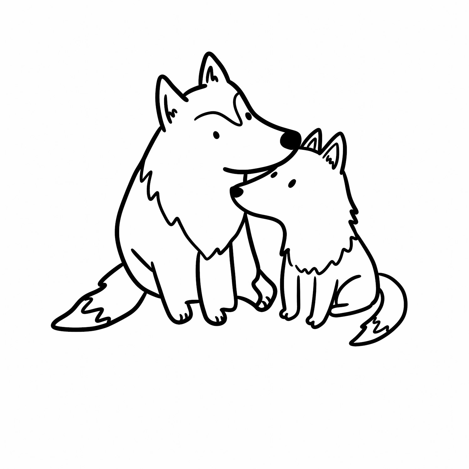 A cute black-and-white illustration of two wolves sitting together, showcasing a heartwarming bond. Perfect for family or nature themes.