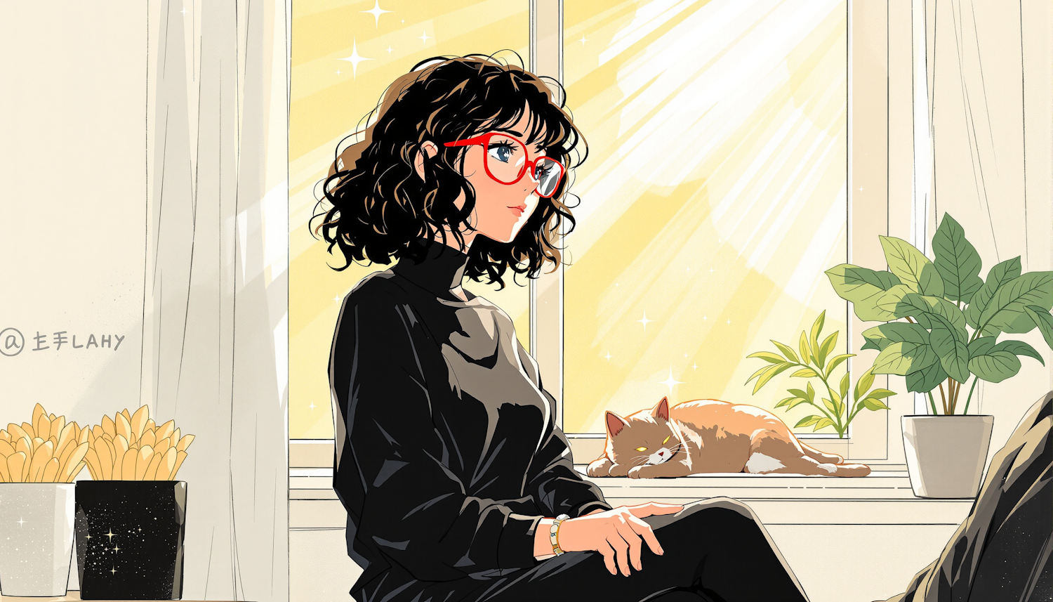 Stylized illustration of a woman with curly hair and red glasses sitting by a sunny window with a cat and plants, radiating calm vibes.