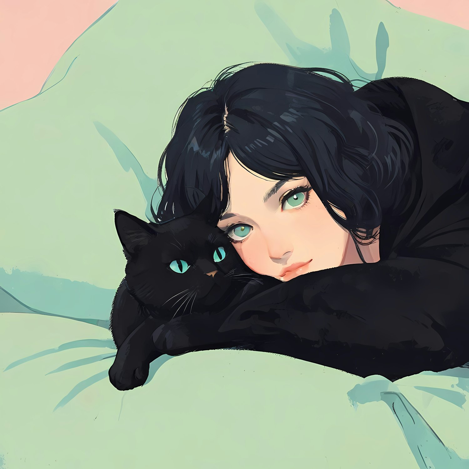 Illustration of a woman with green eyes and a black cat, both resting on a light green pillow against a pastel pink background.