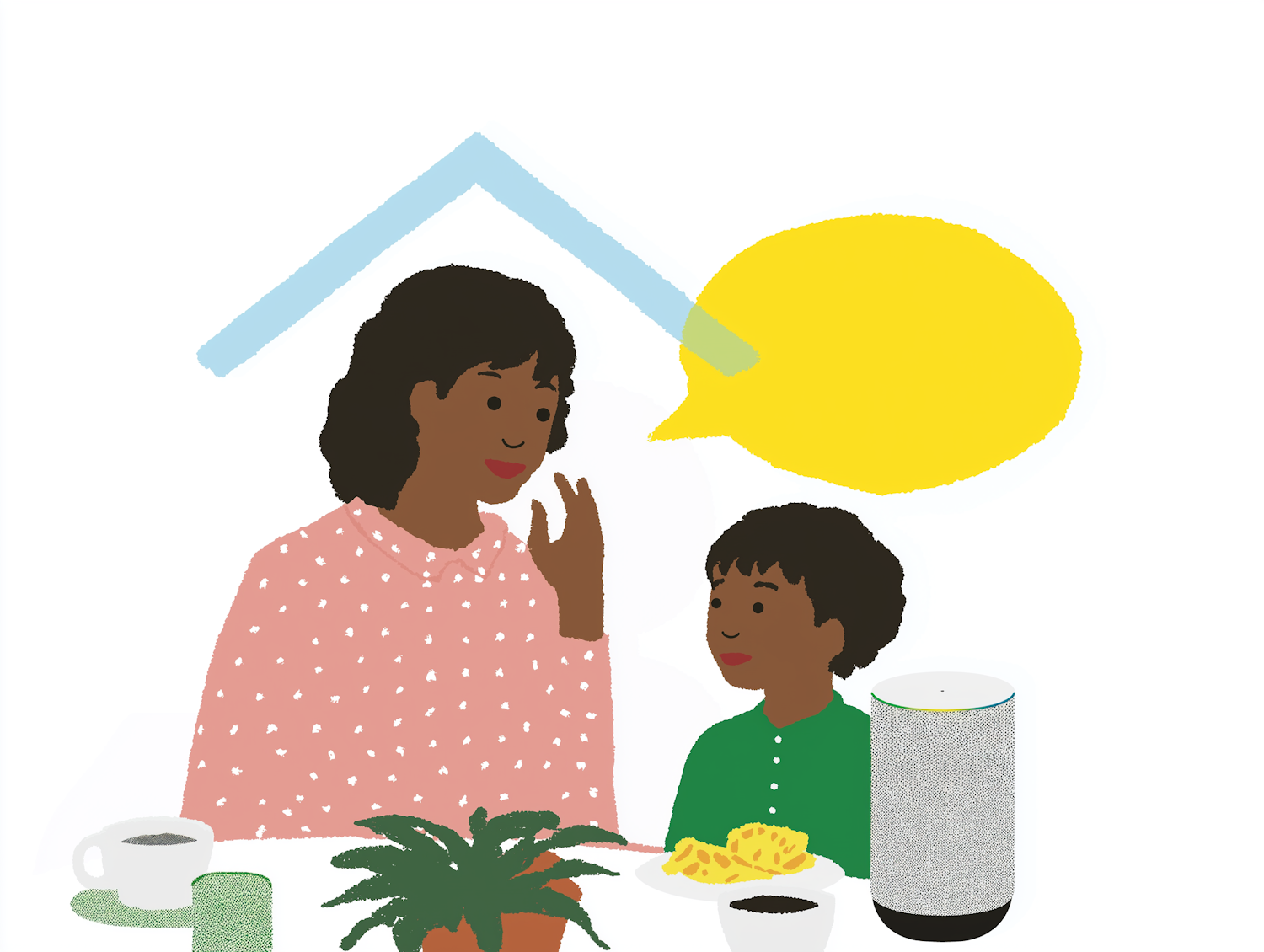 Illustration of a woman and child talking at a table with food and a smart speaker, emphasizing family interaction and technology.