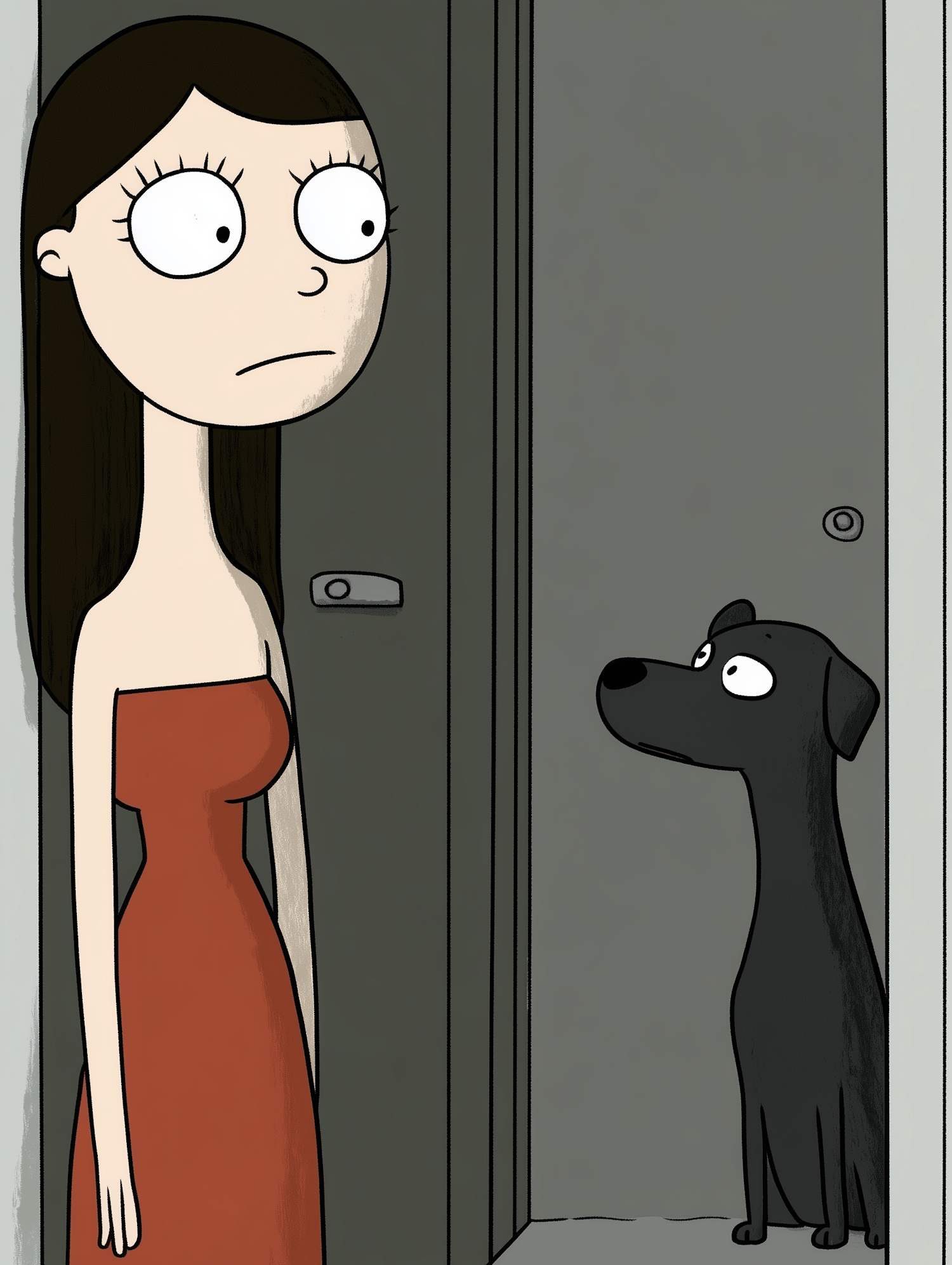 Cartoon woman in red dress and black dog in doorway, minimalist style, neutral expressions.