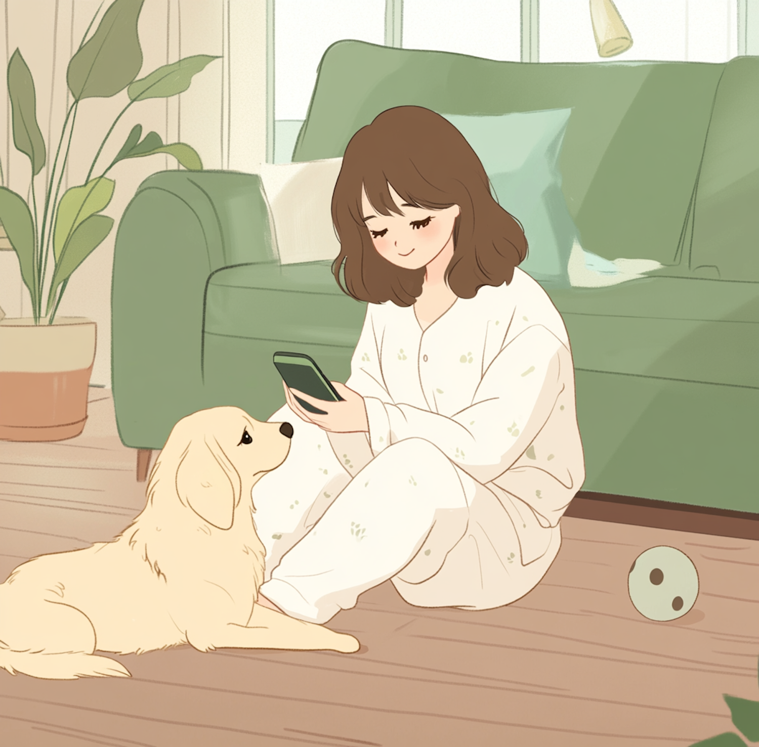 Illustration of a woman in pajamas with her dog in a cozy living room, using a smartphone. Green sofa and potted plant in the background.