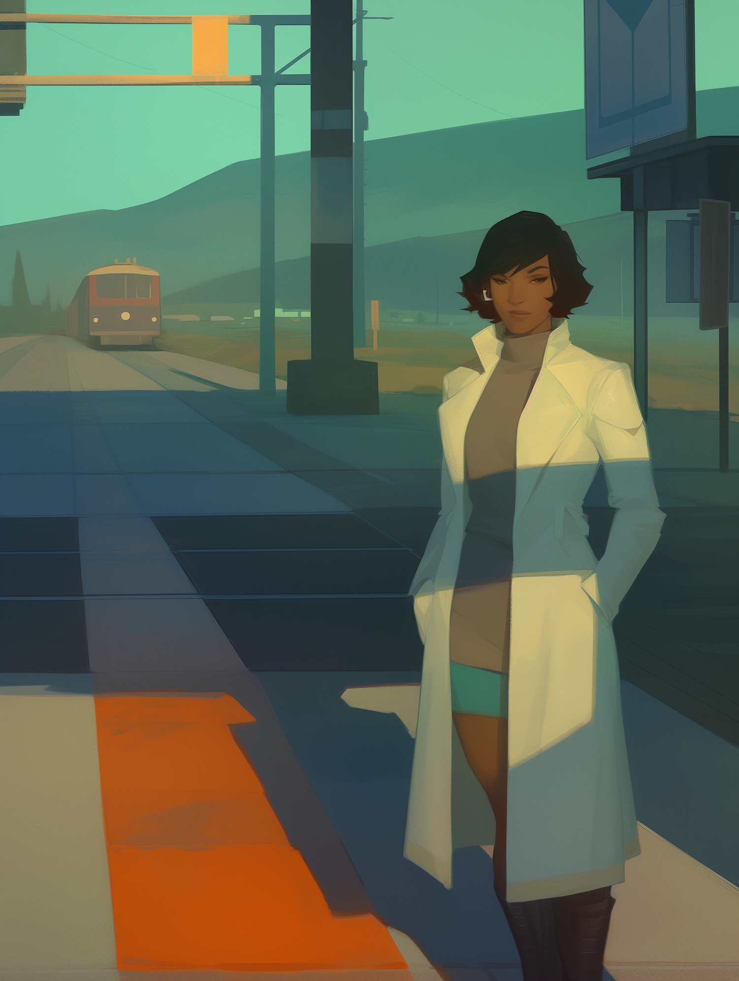 Stylized illustration of a woman at a train station with a serene backdrop and approaching train, featuring modern geometric design.