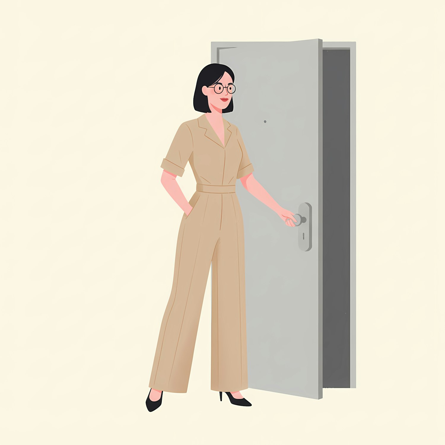 Illustration of a woman in a beige jumpsuit opening a door, with a minimalist beige background.