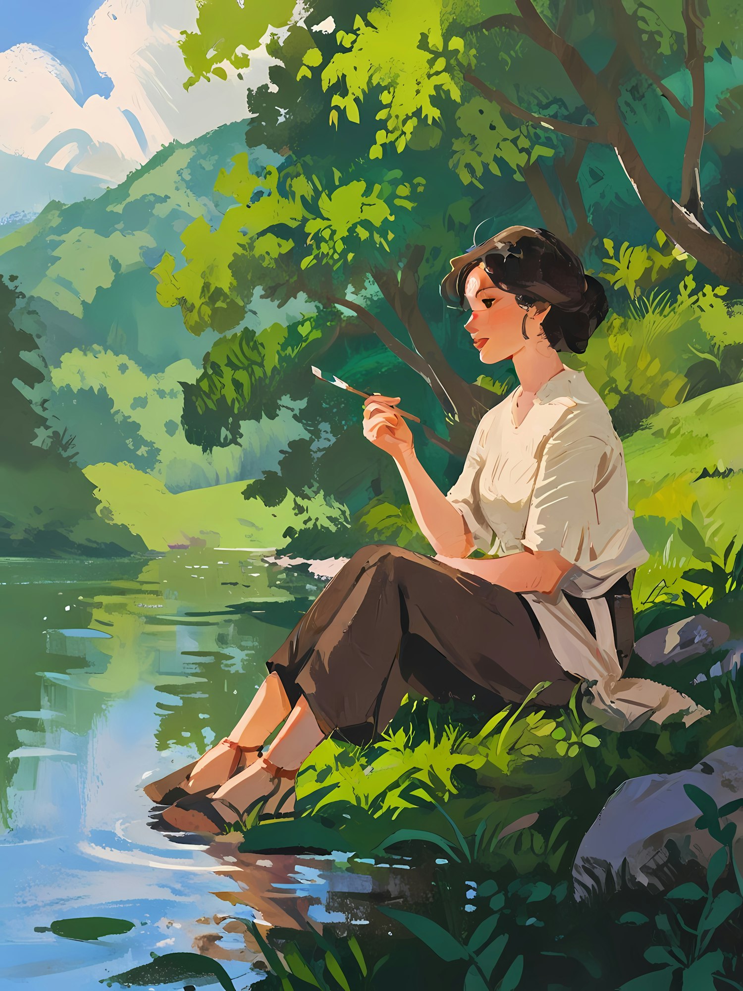 Illustration of a woman sitting beside a calm river in a lush green forest, enjoying a peaceful moment in nature.