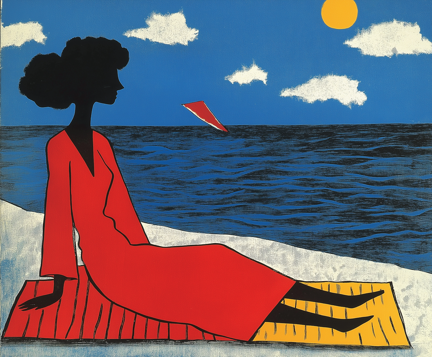 Stylized illustration of a woman in a red dress on a beach, with a blue ocean and a red paper airplane in the sky.