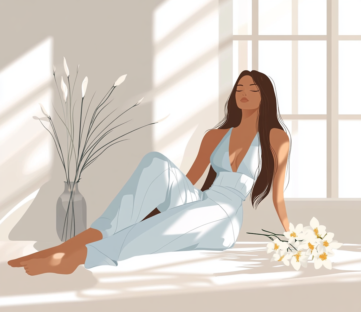 Serene woman in light blue attire relaxes on a sunlit windowsill with flowers, exuding calm and tranquility.