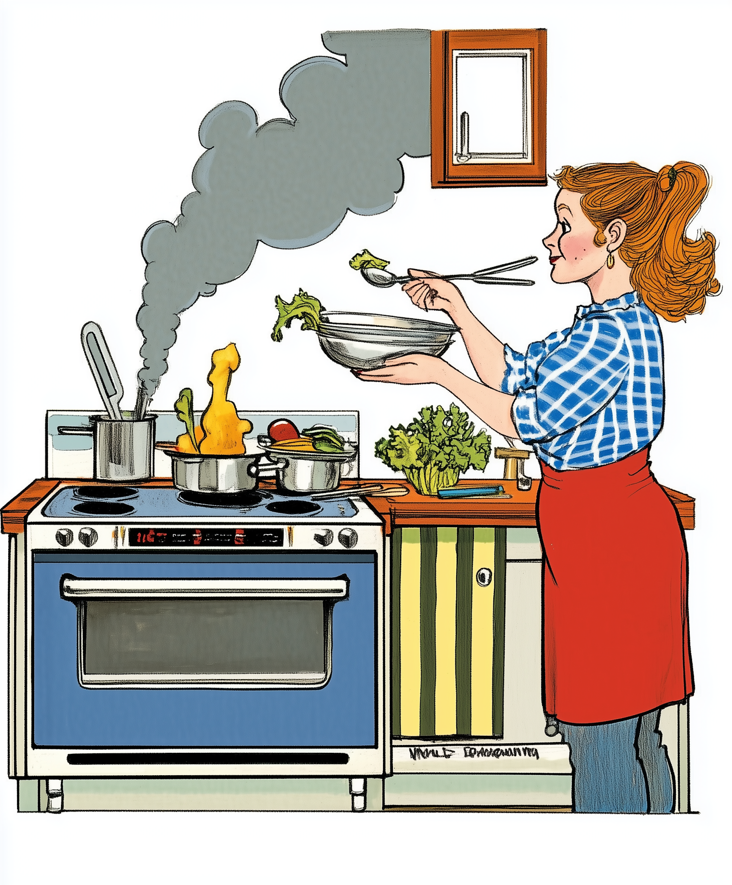 Illustration of a woman cooking in a kitchen with smoke rising from a pot on the stove.
