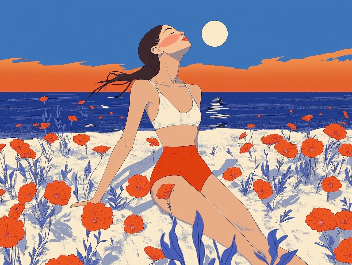 Stylized illustration of a woman on a beach with orange flowers, wearing a white top and red shorts, against a vibrant sunset.
