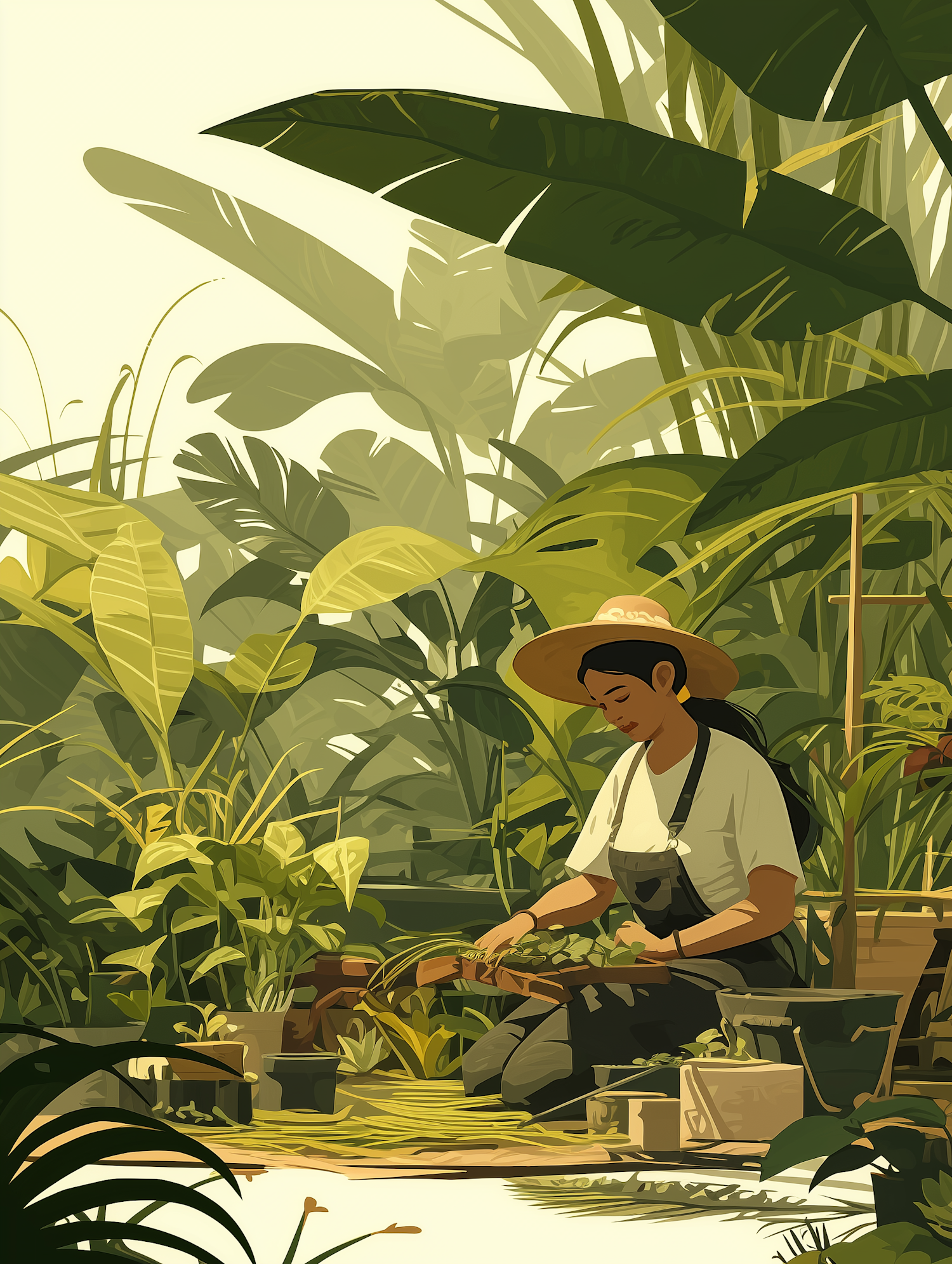 A woman in a straw hat tends to seedlings in a lush garden, surrounded by vibrant green foliage and soft natural light.