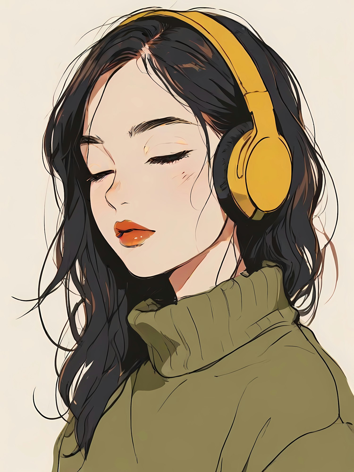 Stylish illustration of a serene woman with yellow headphones and a green sweater, lost in music. Perfect for music or lifestyle themes.