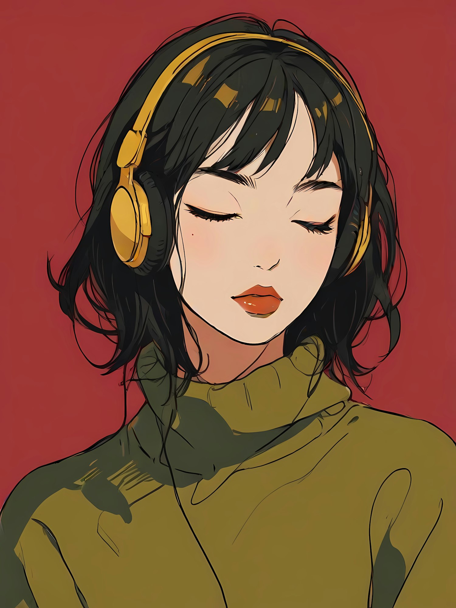 Stylized illustration of a serene woman with black hair, yellow headphones, and an olive-green sweater against a deep red background.