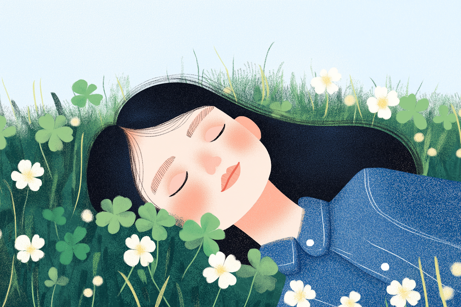 Peaceful illustration of a woman lying in a clover field, eyes closed, surrounded by lush greenery and white flowers. Tranquil and serene.