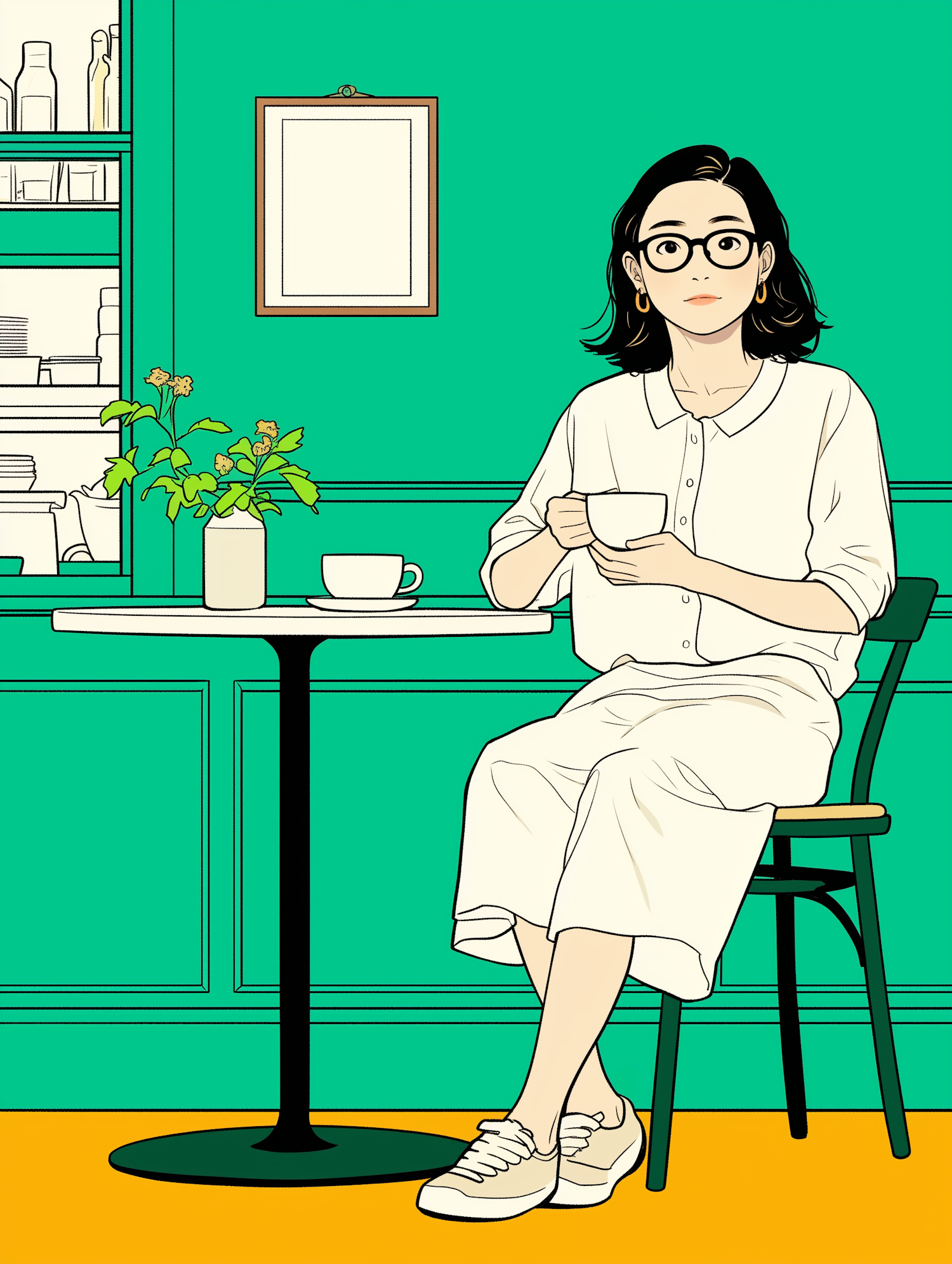 Illustration of a woman in a cafe, wearing glasses and white attire, holding a cup. Vibrant teal and orange colors create a lively atmosphere.