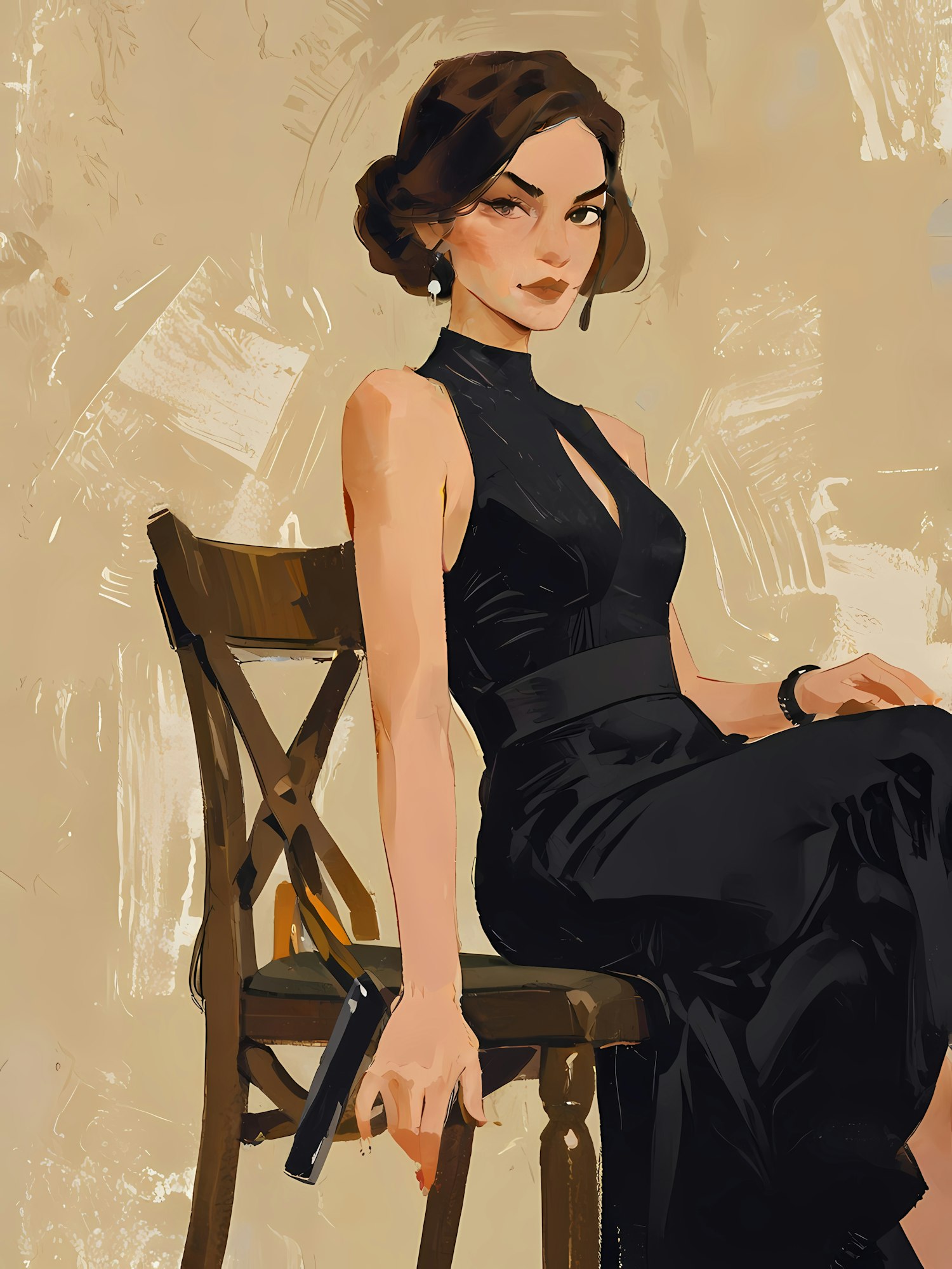 Stylized illustration of an elegant woman in a dark dress, seated on a wooden chair, set against a textured beige background.