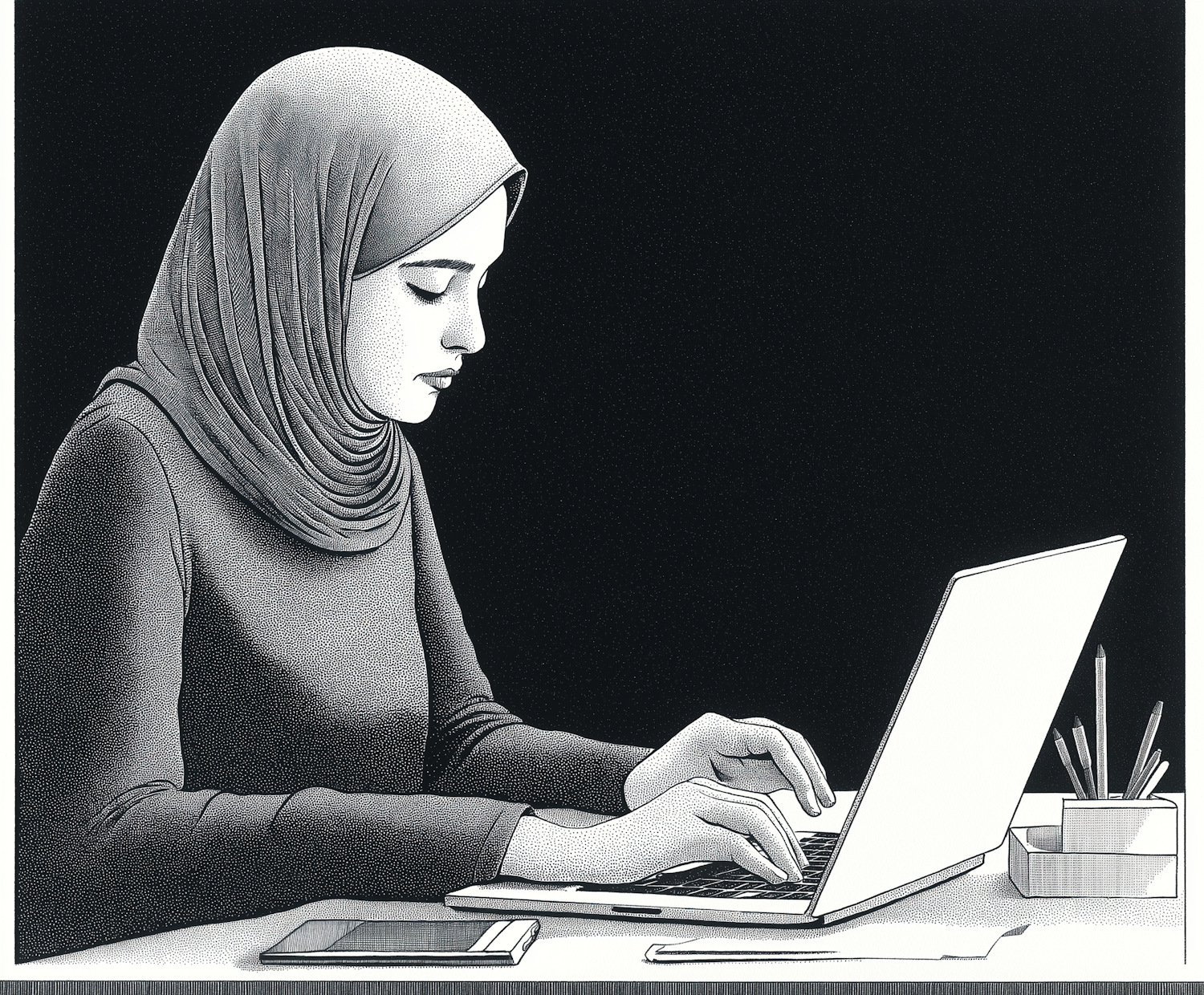 Black and white illustration of a woman in a hijab working on a laptop, with a smartphone and pencils on the desk.