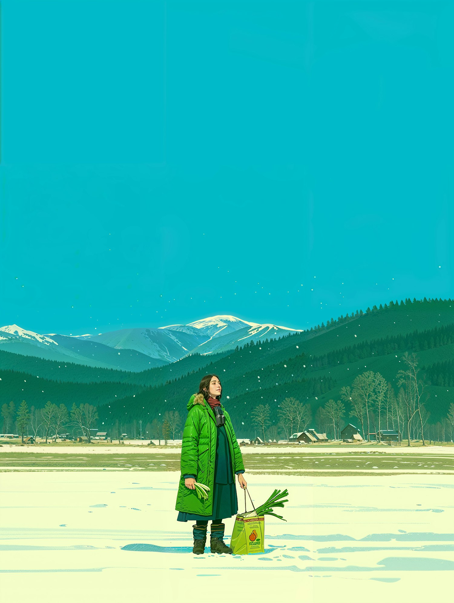 Woman in green coat stands in snowy field with leeks, under a vast blue sky and mountain backdrop. Serene and contemplative scene.