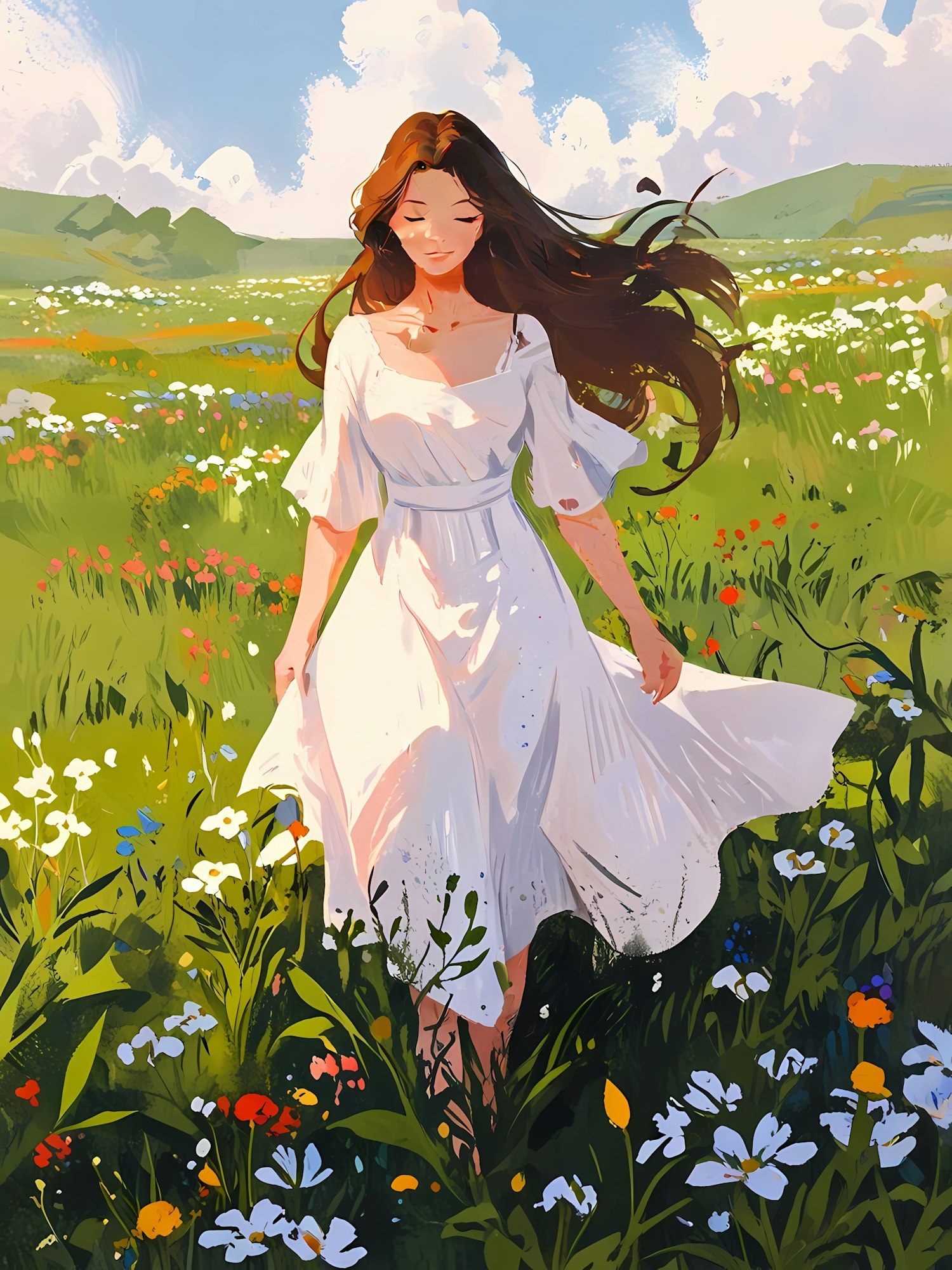 A peaceful painted scene of a woman in a white dress walking through a colorful meadow, under a partly cloudy sky.