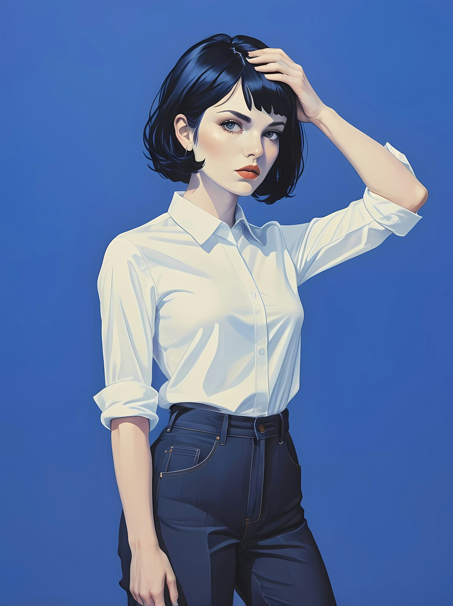 Stylish woman with short black hair in a white shirt and blue jeans against a blue background, exuding modern elegance.