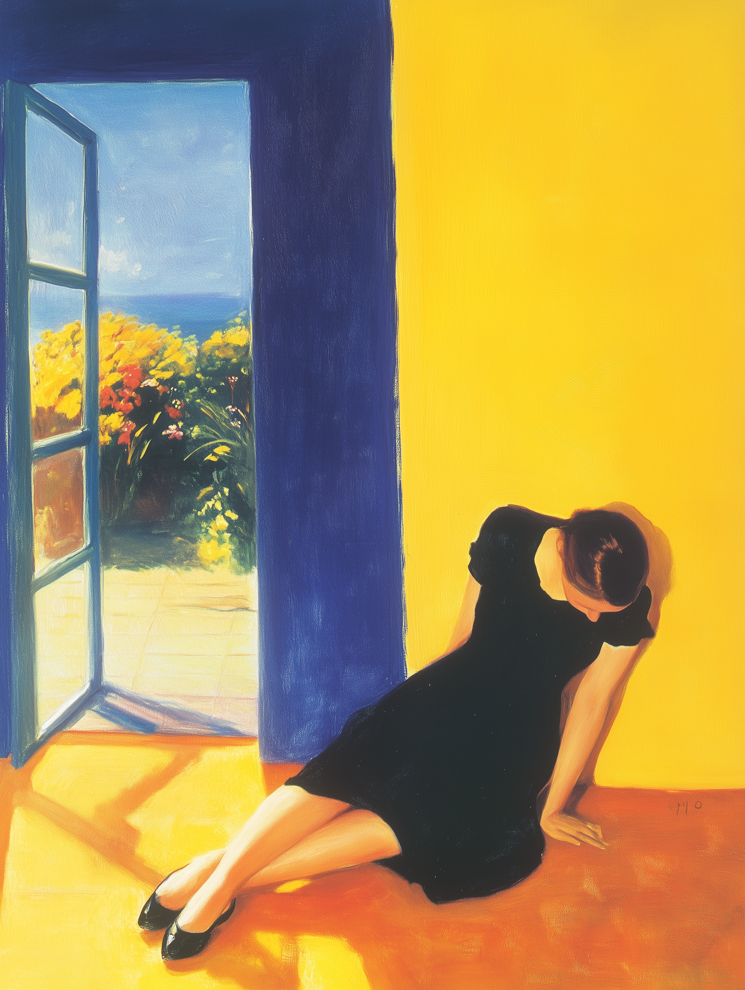 A woman in a black dress sits on a yellow floor near an open door, with sunlight streaming in and a view of a garden and sea outside.