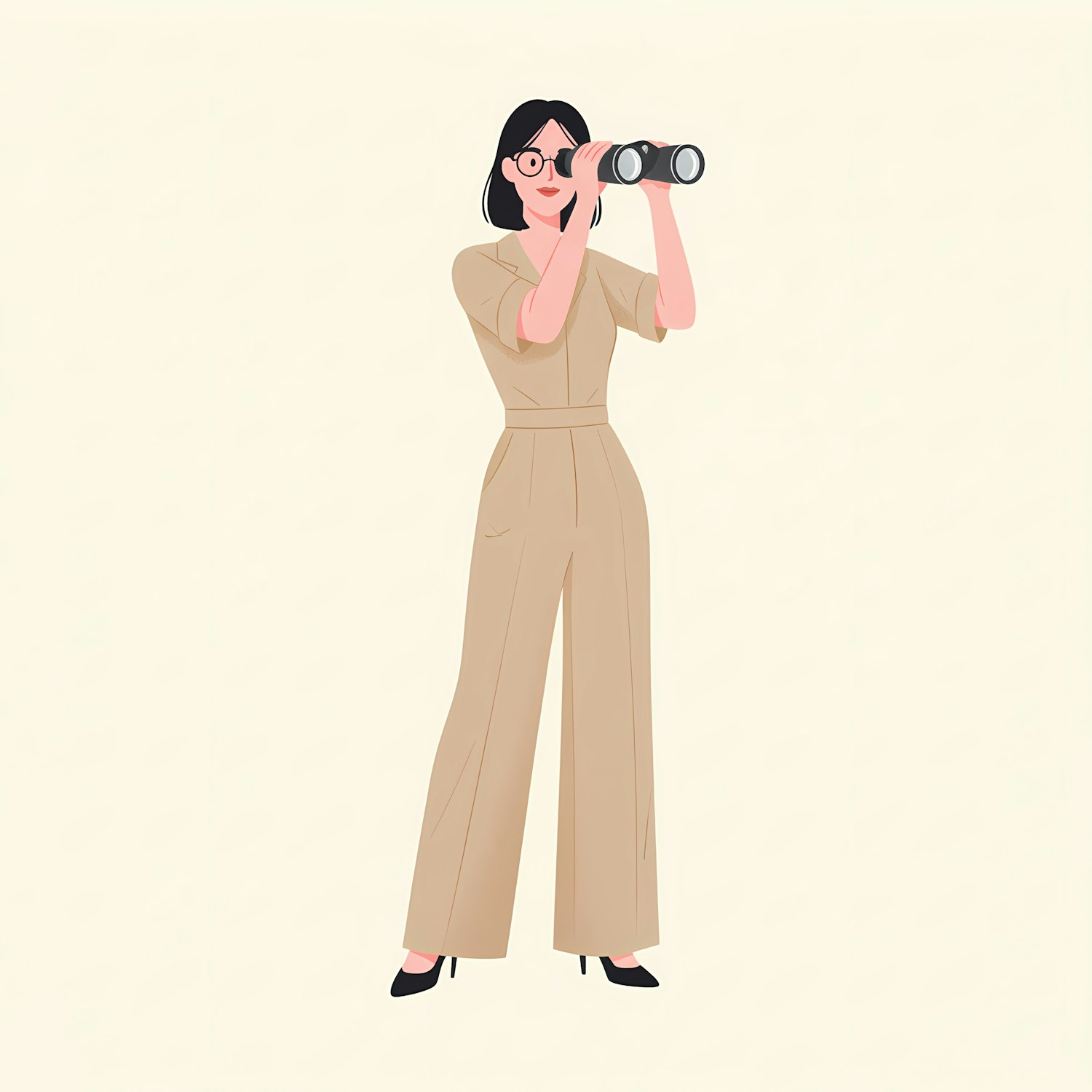 Illustration of a woman in a beige jumpsuit using binoculars, set against a light background, conveying exploration and curiosity.