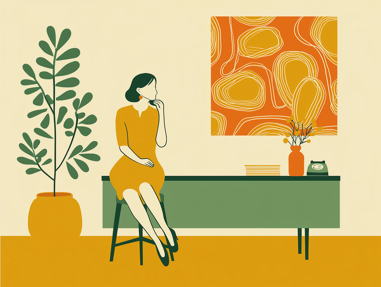 Minimalist illustration of a woman in a mustard dress sitting in a retro-styled room with a green bench, abstract art, and a vintage rotary phone.