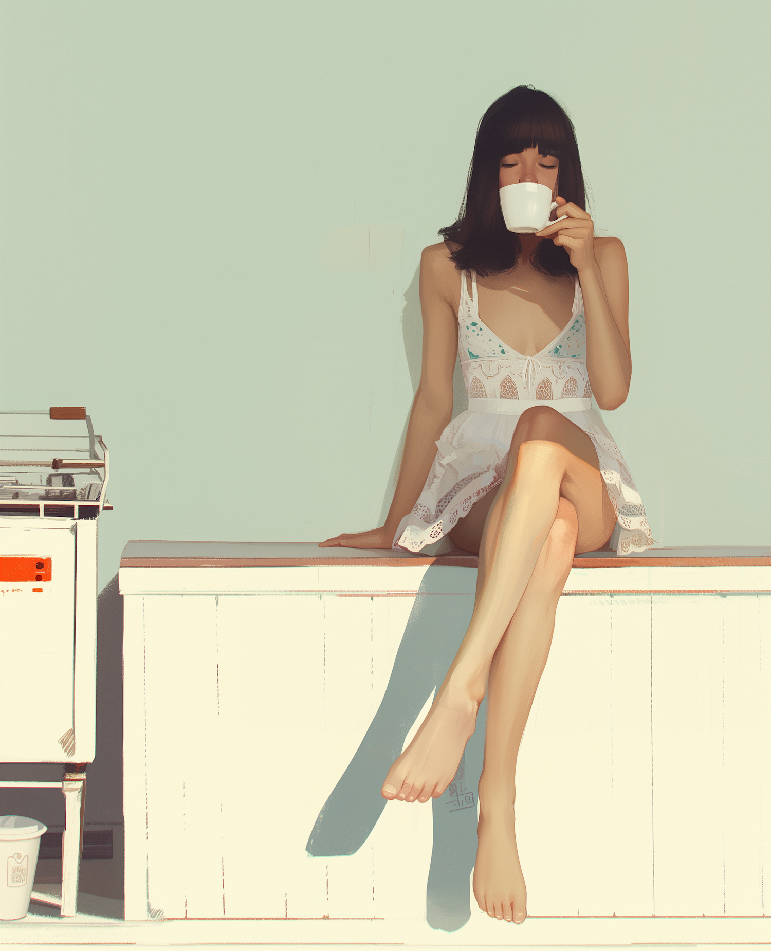 A serene illustration of a woman in a white lace dress enjoying a drink, sitting on a white bench with soft pastel tones in the background.