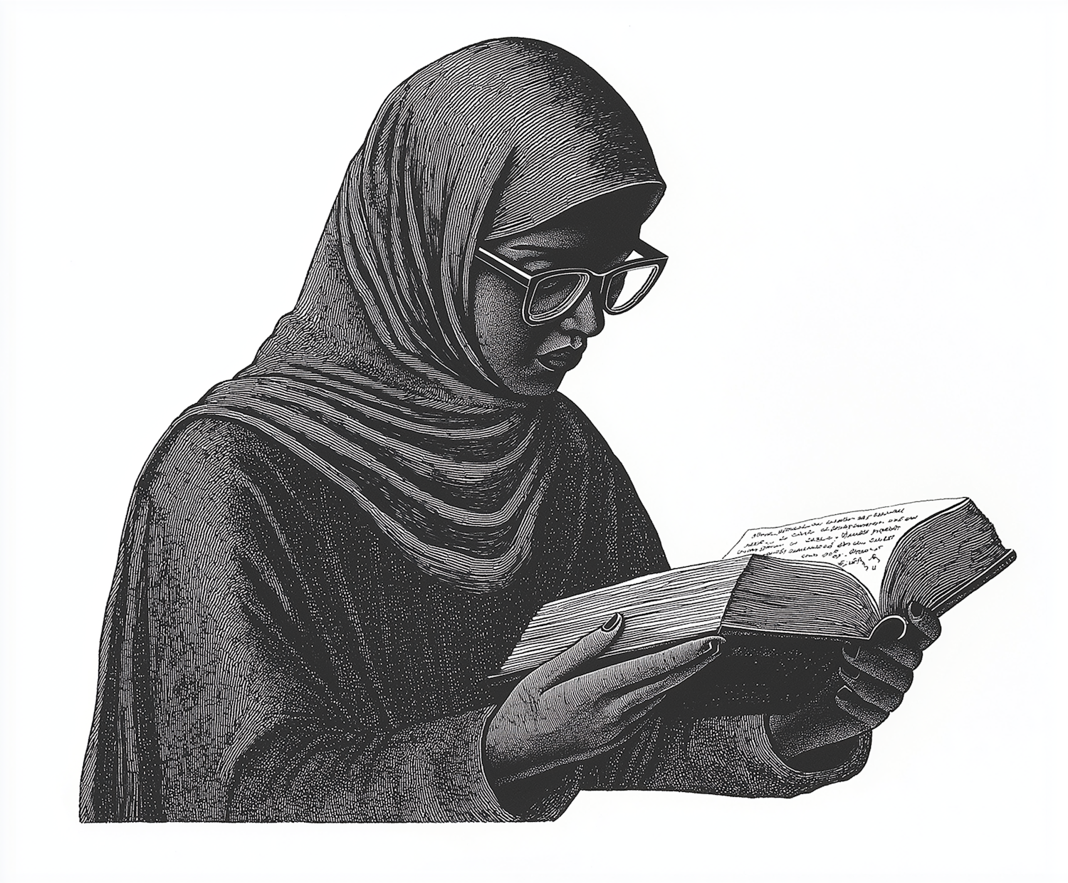 Intricate black and white illustration of a woman in a hijab reading a book, showcasing detailed line work and a contemplative expression.