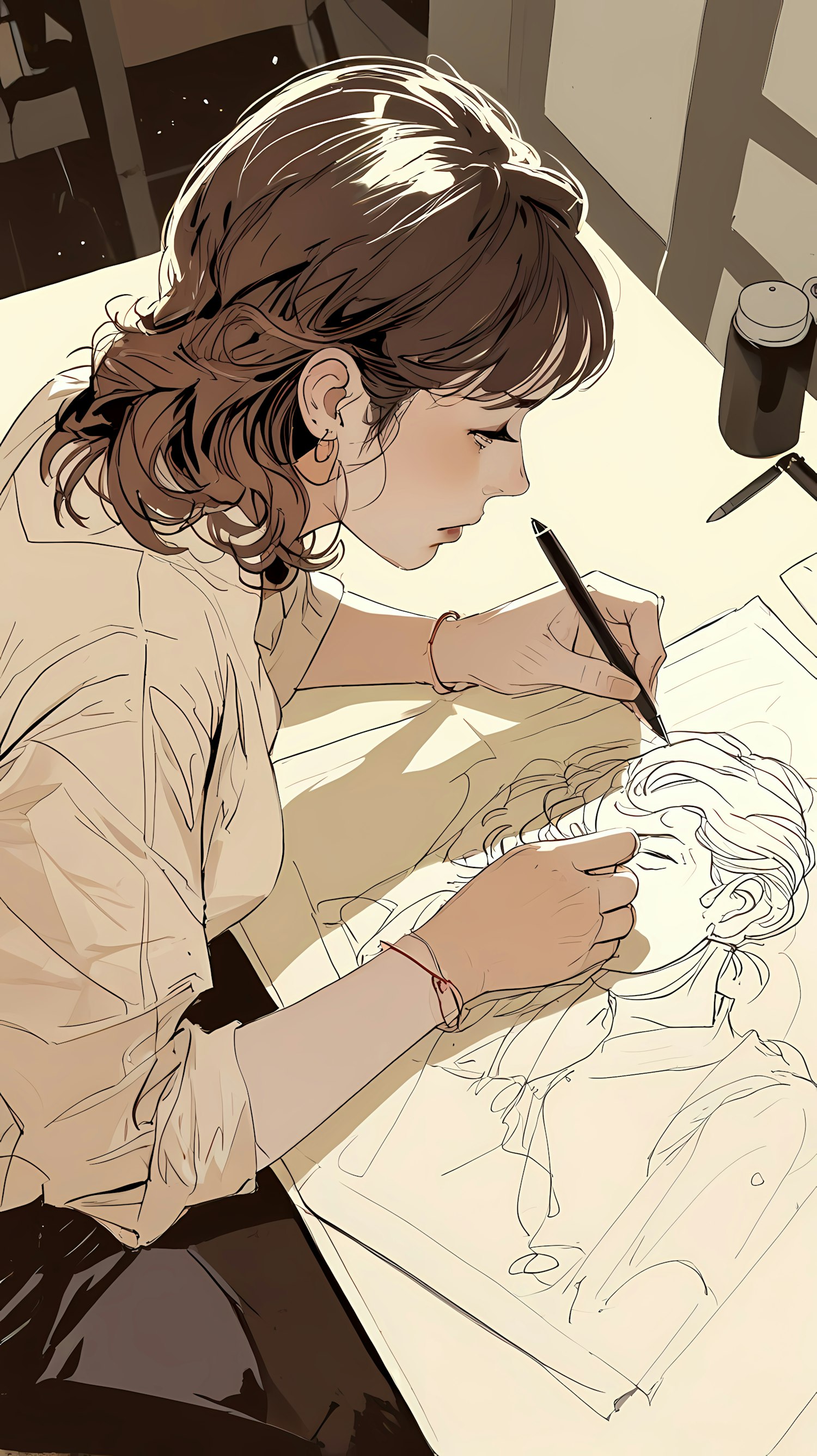 An illustration of a young artist drawing, capturing her intense focus and delicate pencil work in a minimalist setting.