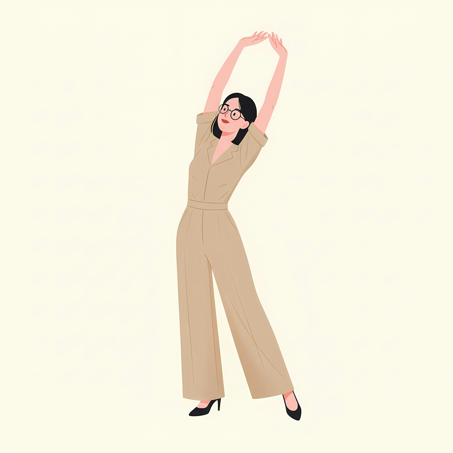 Illustration of a woman in a beige jumpsuit stretching with arms raised, wearing glasses and black heels, on a light beige background.