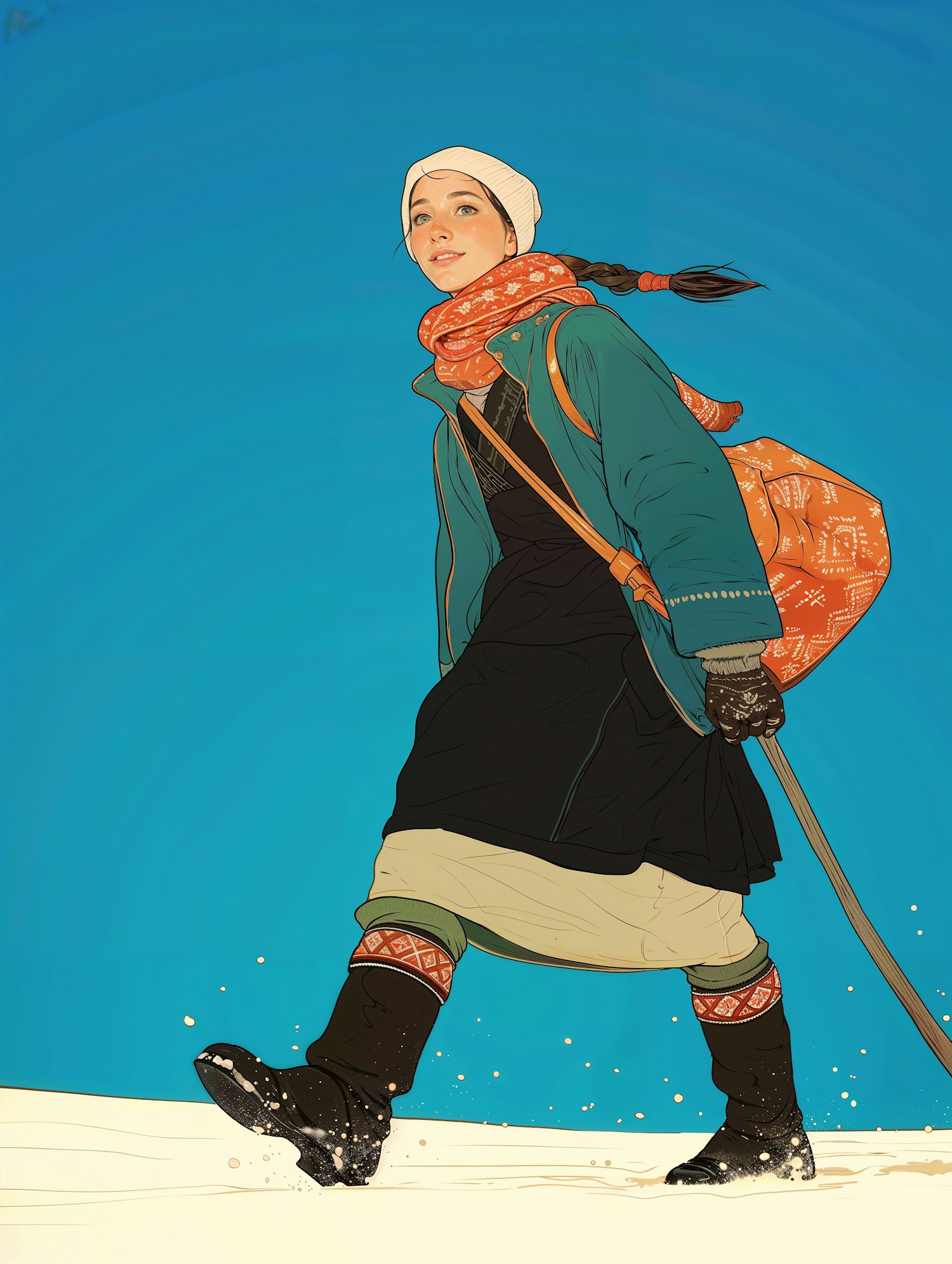 Illustration of a young woman in winter attire walking through snow, with a blue sky backdrop. Vibrant colors and dynamic movement.