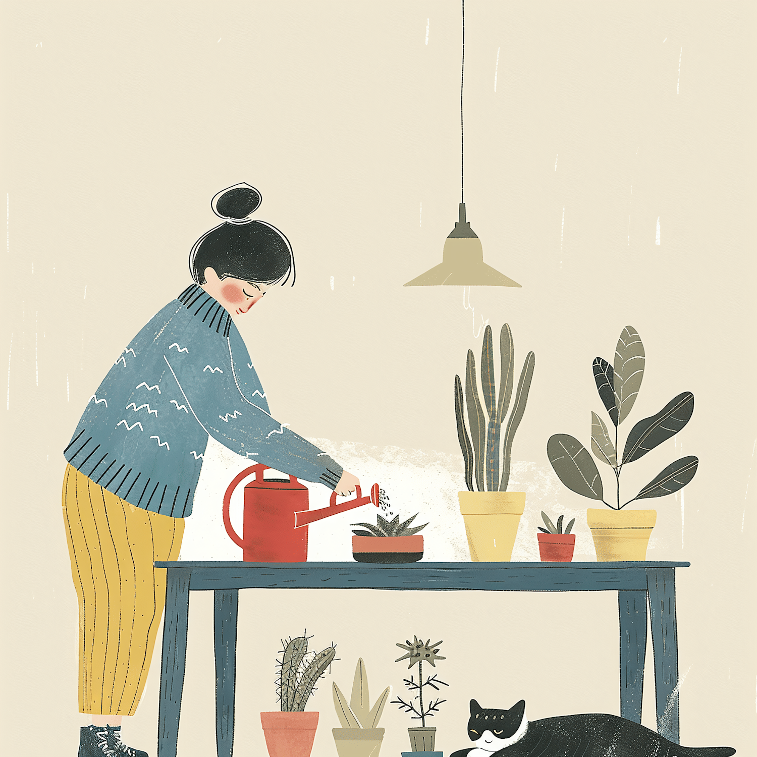Illustration of a woman watering plants on a table with a cat underneath, set in a cozy, minimalist room.