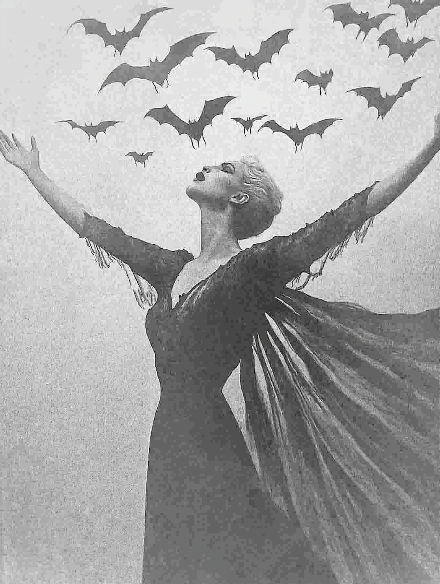 A woman in a flowing dress stands with arms outstretched, surrounded by flying bats in a mystical black and white illustration.