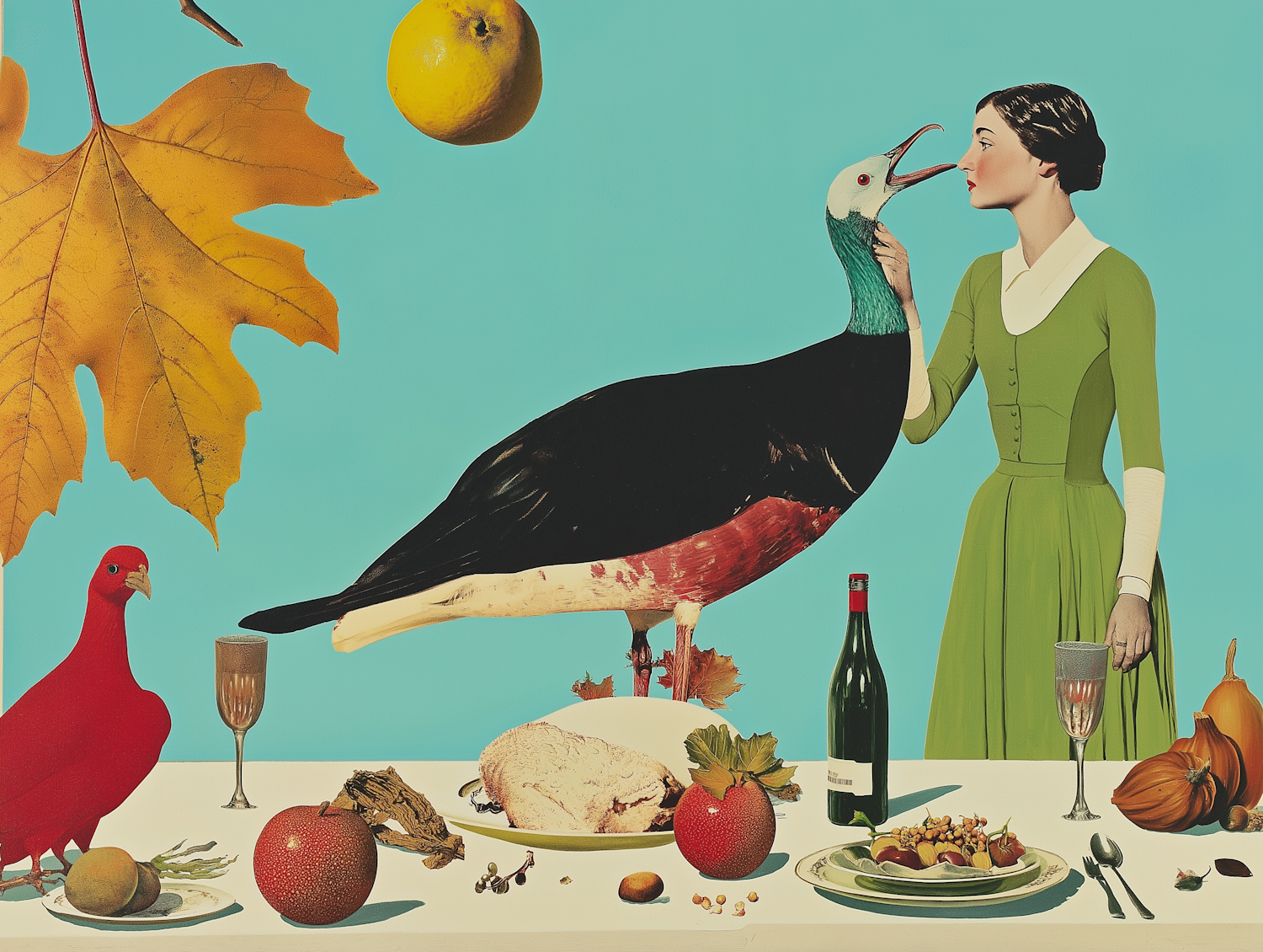 Surreal scene with a woman in a green dress, a large bird, and a whimsical table setting against a turquoise background.