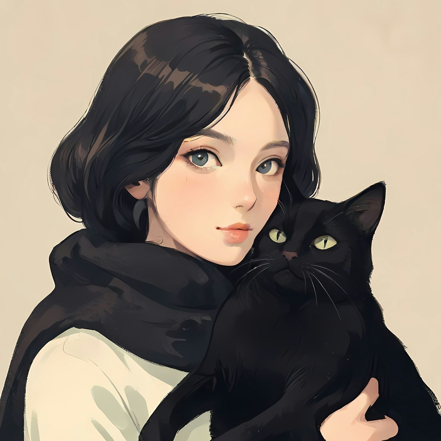 Illustration of a woman with black hair holding a black cat, both with striking eyes, set against a beige background.